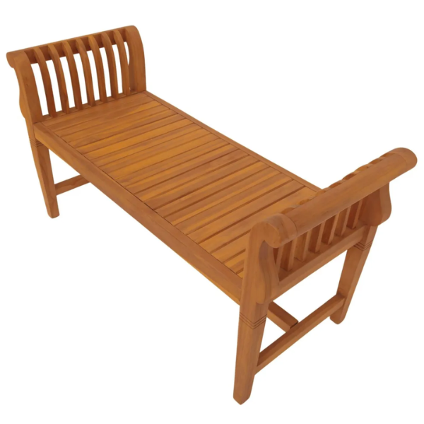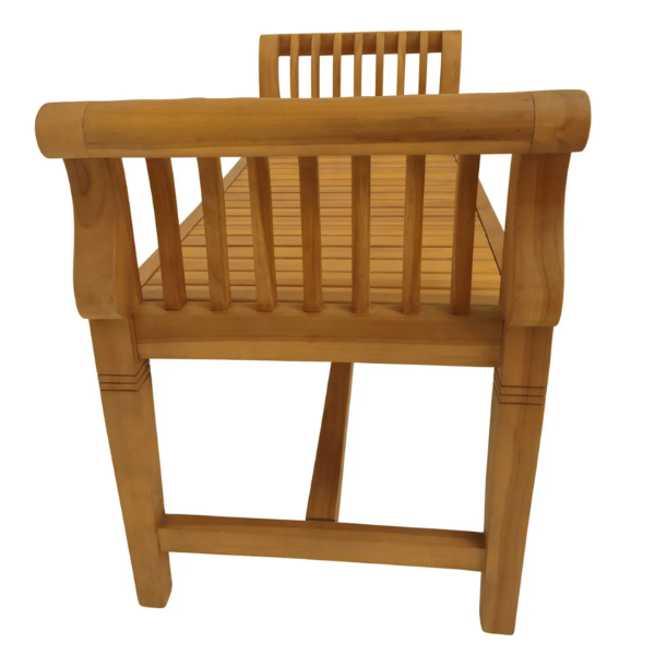 Die robuste Bauweise sorgt für Stabilität und langlebige Qualität, während die naturbelassene Oberfläche mit ihren warmen Farbtönen und der glatten Textur besticht. Im Laufe der Zeit entwickelt das Teakholz eine edle Patina, die den Charakter der Bank noch weiter unterstreicht.