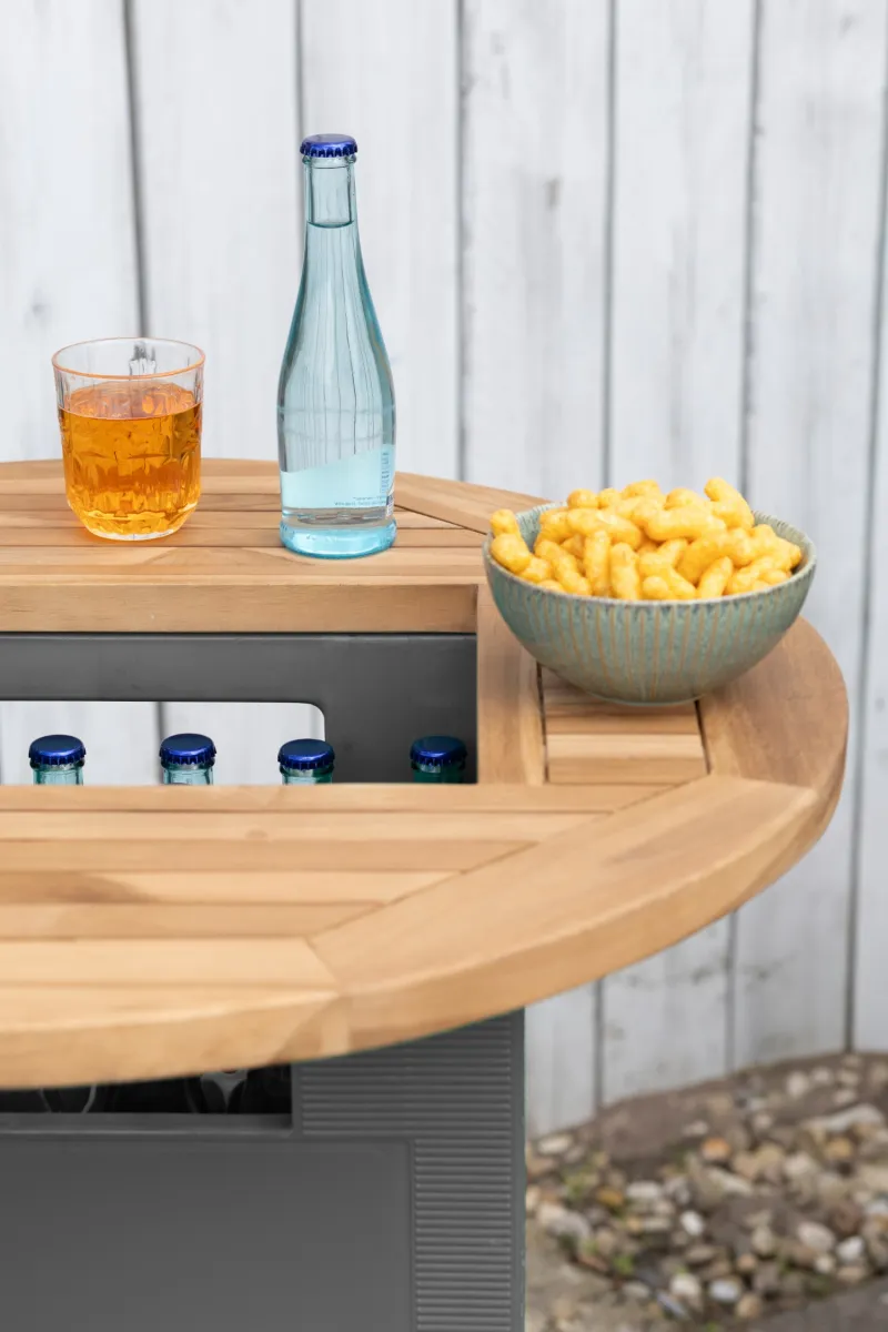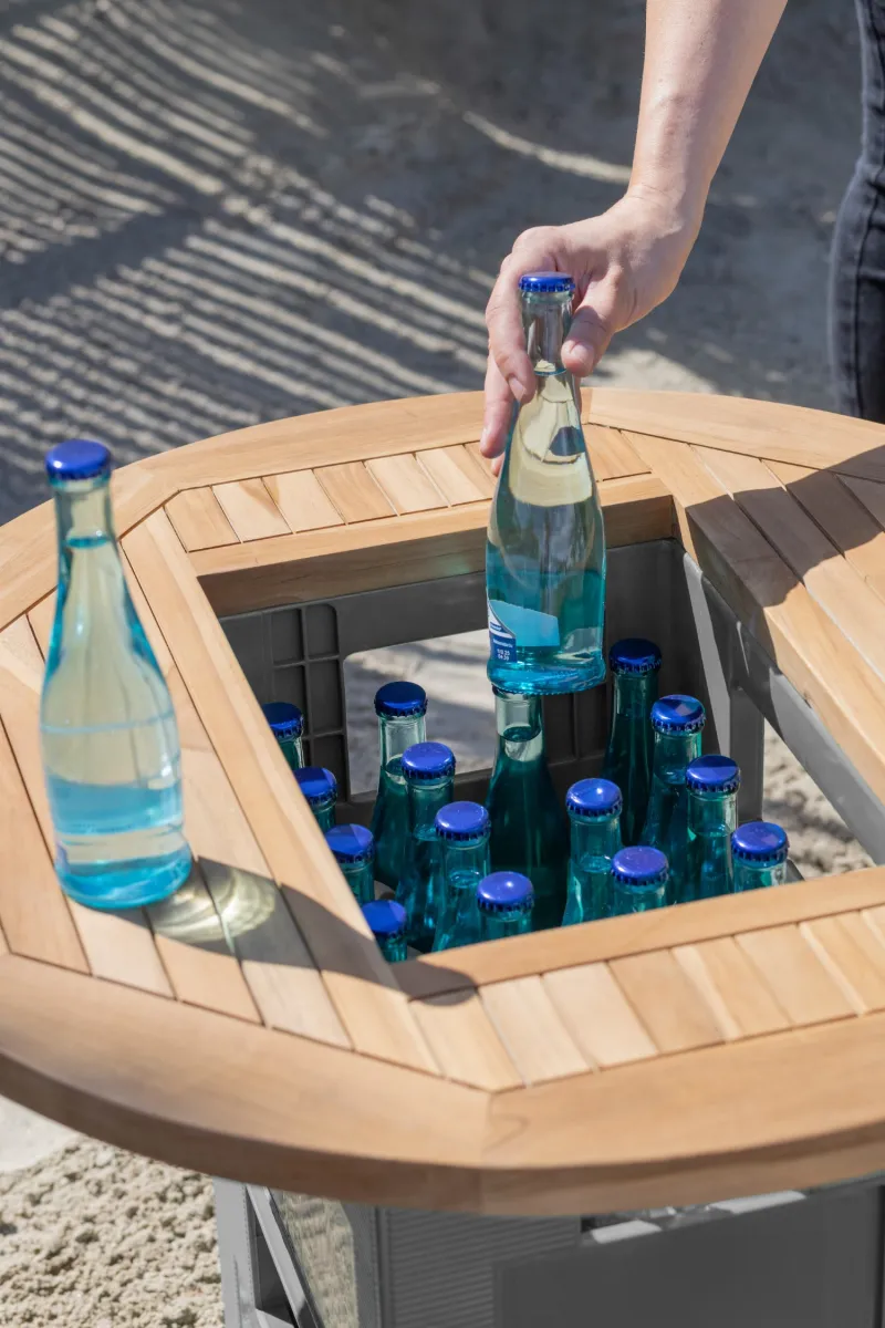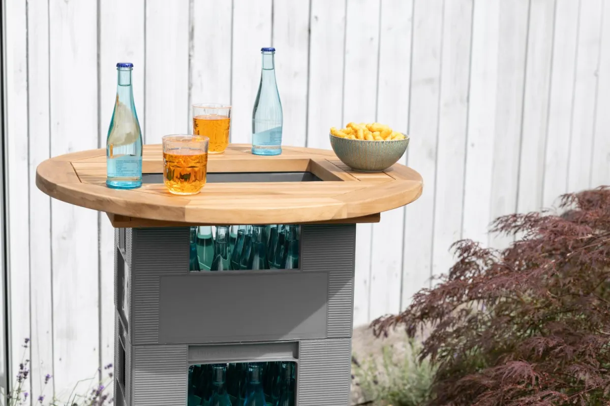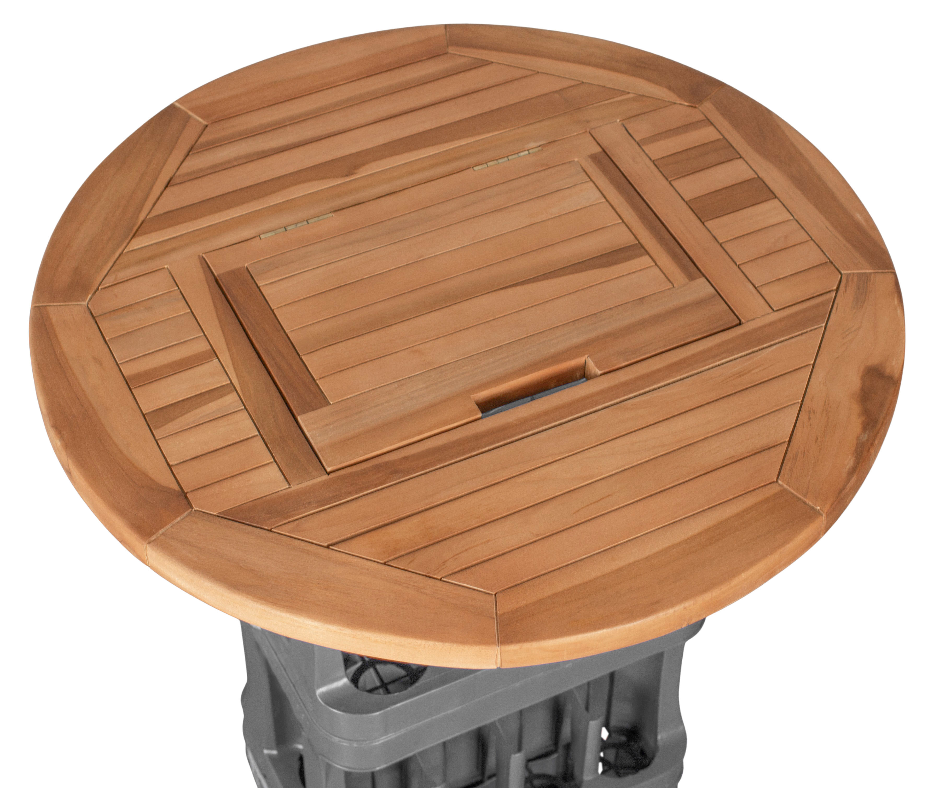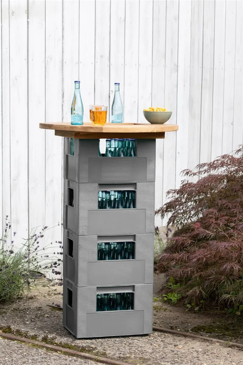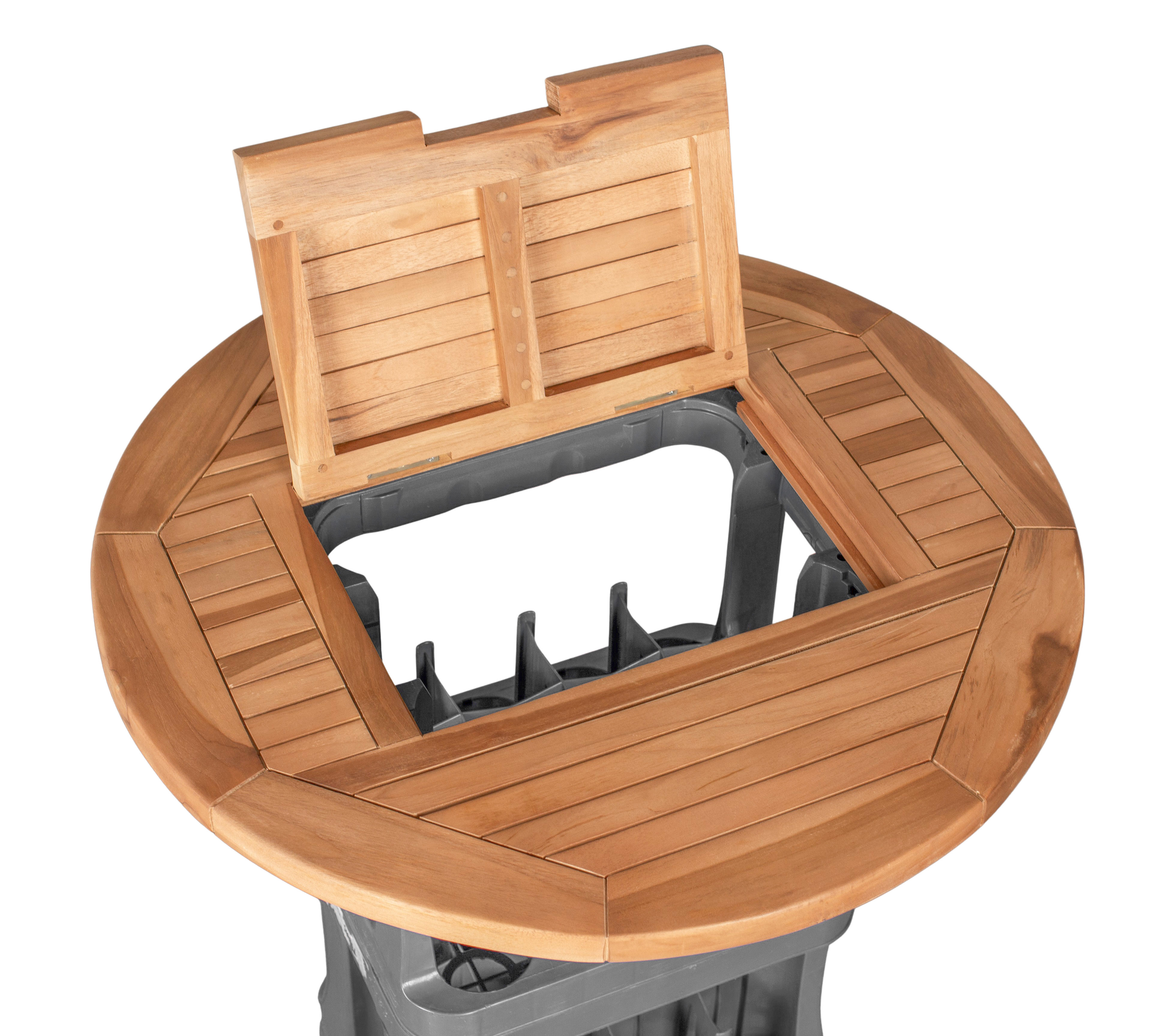 Bierkistenaufsatz aus zertifiziertem, massivem Teakholz mit natürlicher, unbehandelter Oberfläche und integrierter Klappe zum Durchgreifen. Die robuste Ausführung eignet sich ideal für den ganzjährigen Einsatz im Innen- und Außenbereich und verleiht jeder Bierkiste eine stilvolle, funktionale Tischfläche. Wetterfest, langlebig und vielseitig einsetzbar – perfekt als mobiler Beistelltisch auf Balkon, Terrasse oder im Garten.