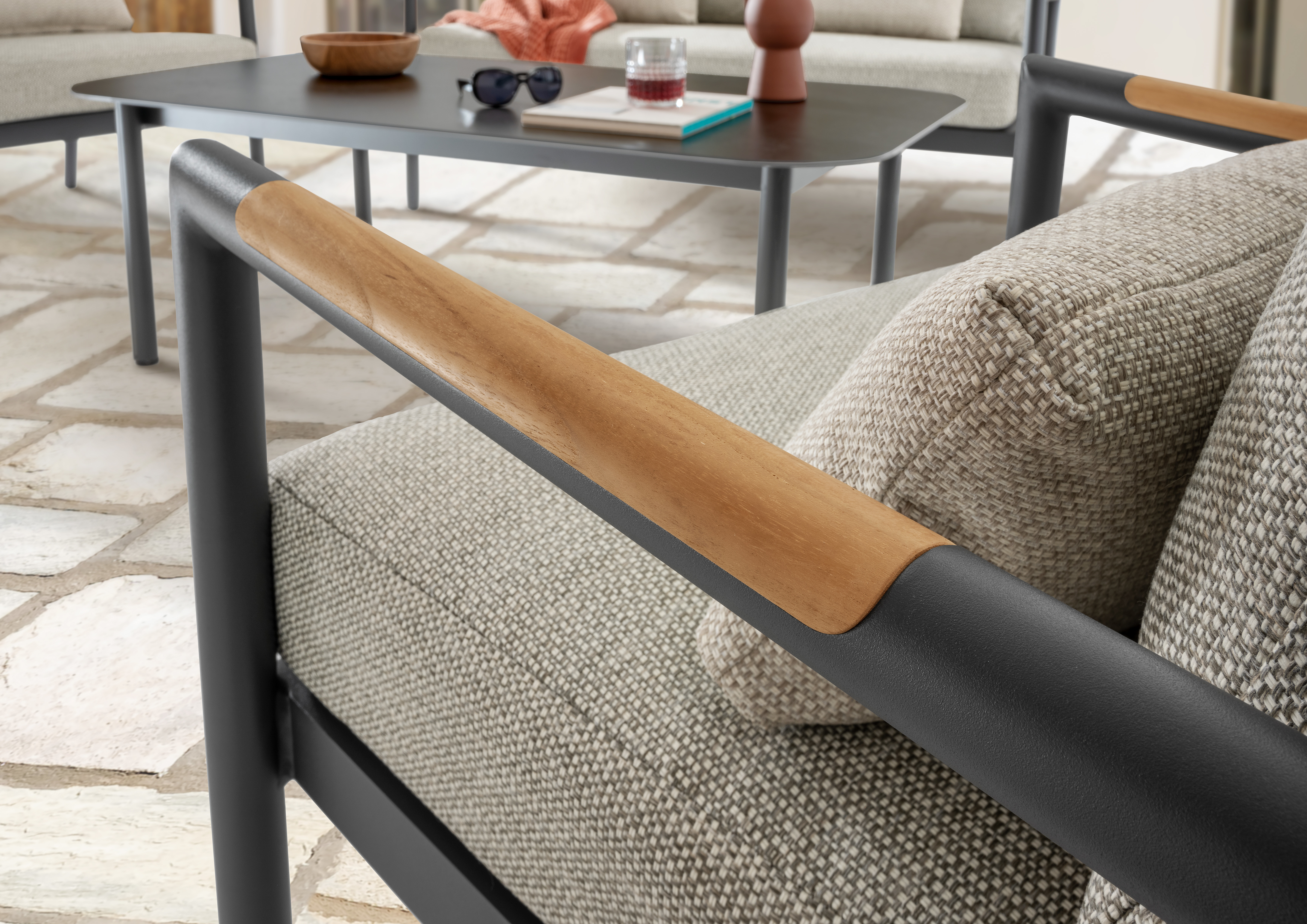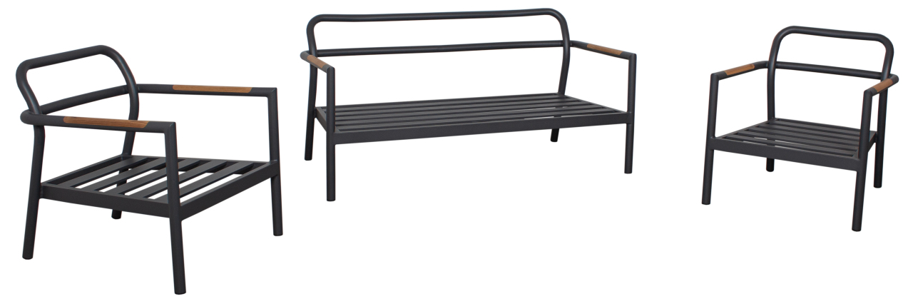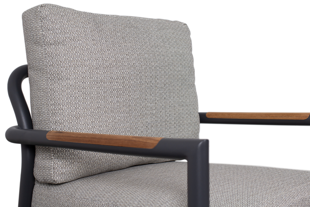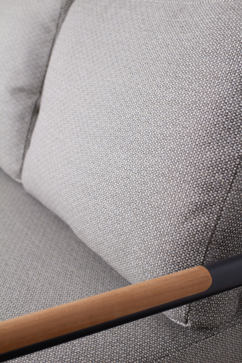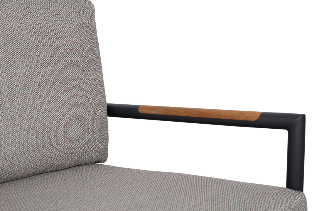 Die Sitzgruppe zeichnet sich durch ihre hochwertige Verarbeitung und die Verwendung von robusten Materialien aus. Das Gestell besteht aus Aluminium, was das Set besonders langlebig und pflegeleicht macht. Die Teakarmlehnen verleihen dem Set eine natürliche Note und sorgen für ein angenehmes Sitzgefühl.