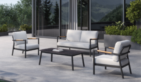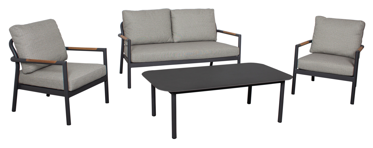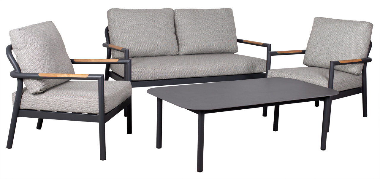 Die Sitzgruppe "Bilbao Aluminium" ist die perfekte Wahl für alle, die stilvolles Design und höchsten Komfort suchen. Dieses Set besteht aus einem Loungetisch, zwei Sesseln und einem 2er Sofa mit Teakarmlehnen und bietet somit genügend Platz für gemütliche Stunden zu zweit oder in geselliger Runde.