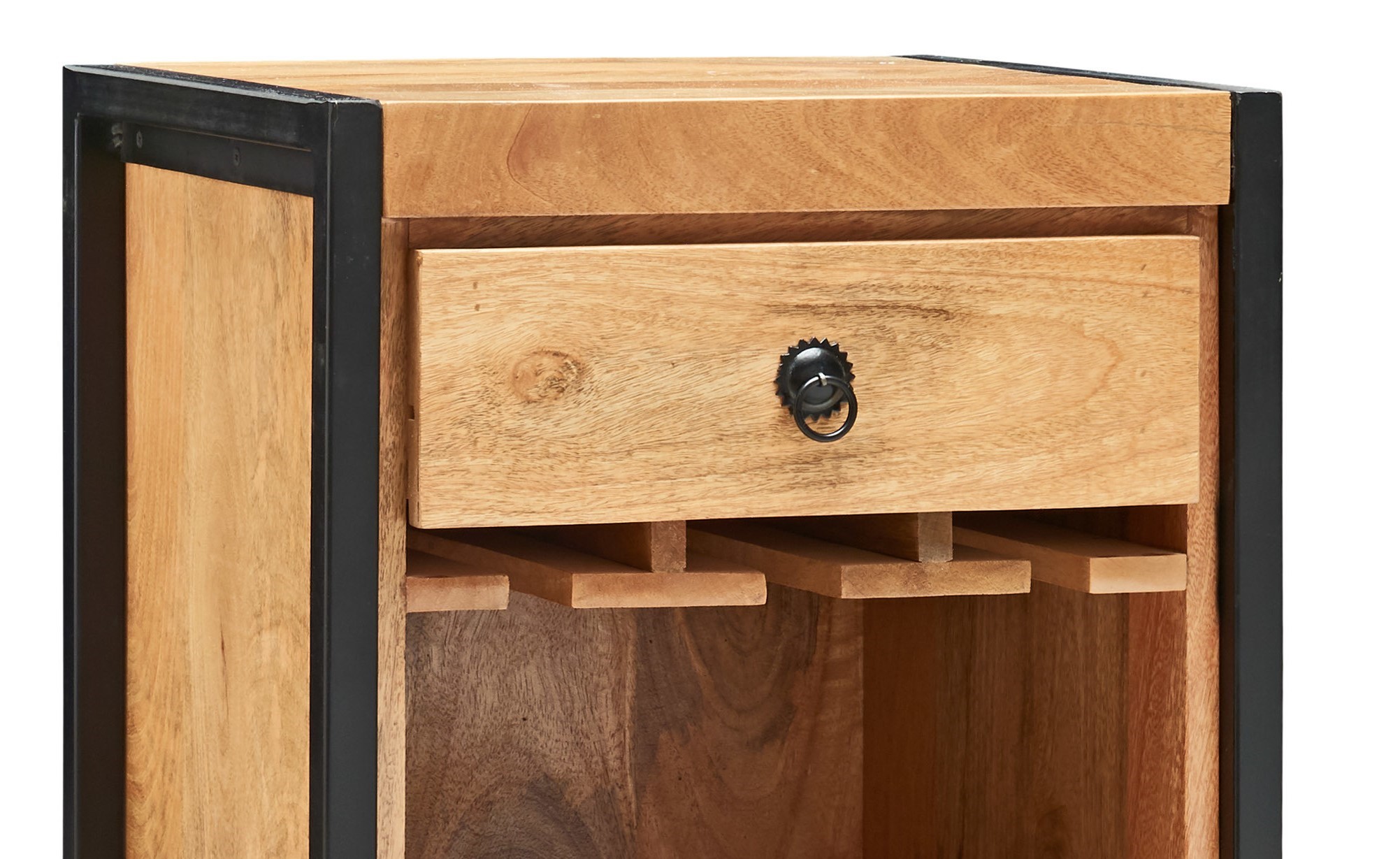 Das wunderschöne Mangoholz in Vintage-Optik sorgt für eine warme und einladende Atmosphäre. Die schwarzen Metallapplikationen an der Front setzen stilvolle Akzente und unterstreichen das moderne Design.