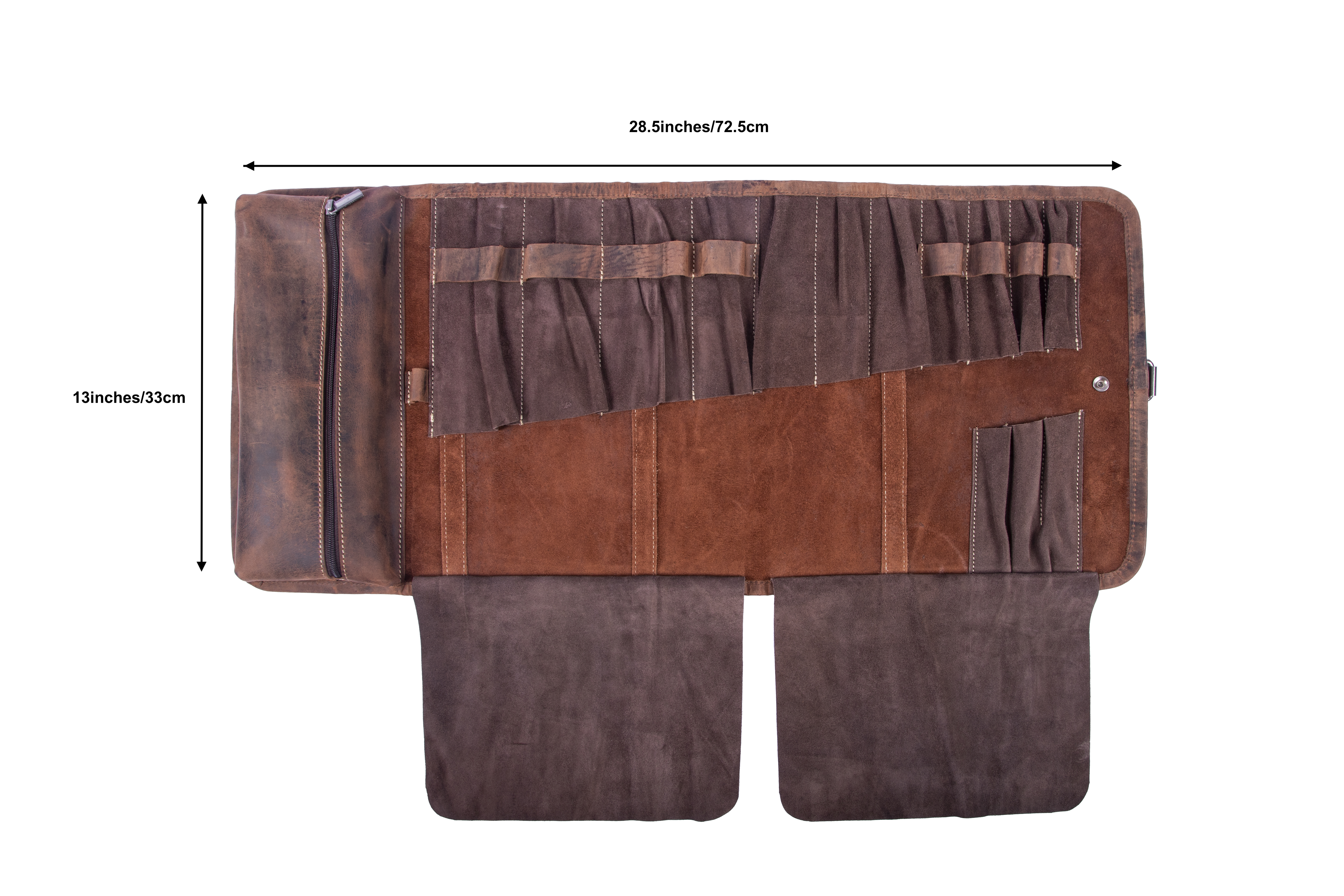 Für einen professionellen Koch sind exzellente Messer unerlässlich. Damit diese sicher geschützt sind, wird jedes Messer in der Rolle durch eine Wildlederabdeckung vor Kratzern bewahrt. Zusätzlich bietet die Messerrolle ein verschließbares Fach mit Reißverschluss, in dem weitere wichtige Utensilien sicher aufbewahrt werden können.