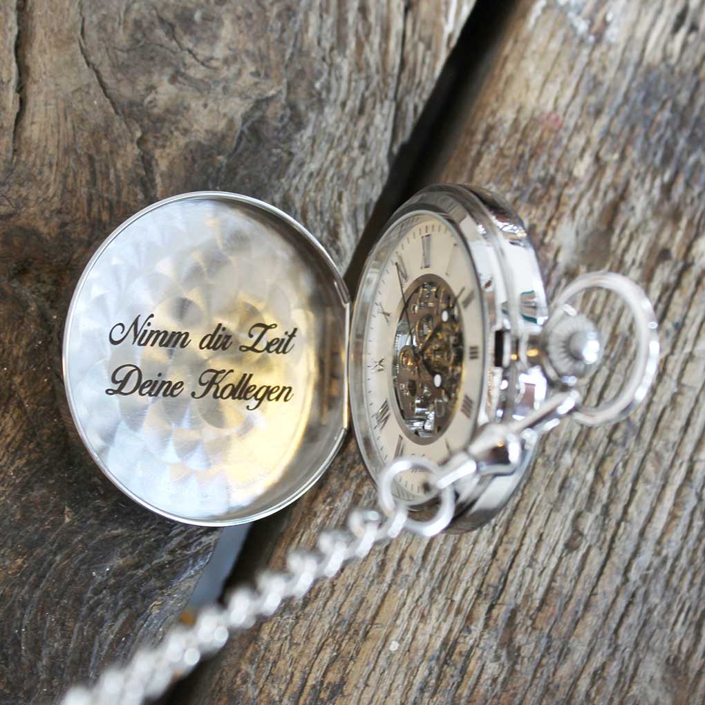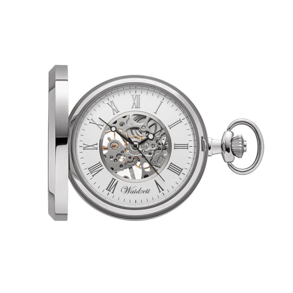 Diese Skelett-Taschenuhr mit Sprungdeckel und Handaufzug ist ein absolutes Lieblingsstück! Sie hat am Ziffernblatt römische Zahlen und ein Sichtfenster auf die Mechanik. Zudem ist das Edelstahlgehäuse auf der Rückseite mit einem Sichtfenster auf das Uhrwerk ausgestattet.