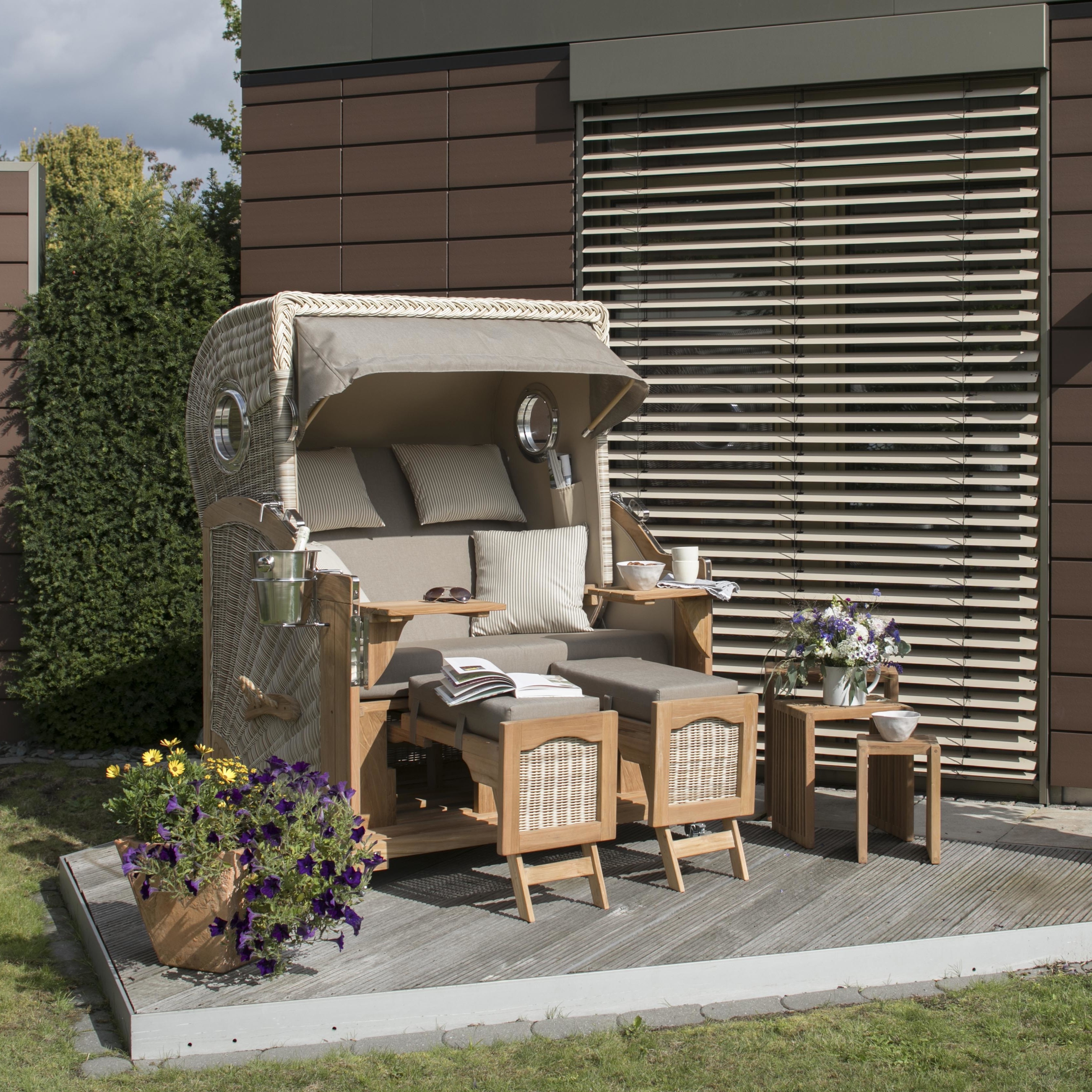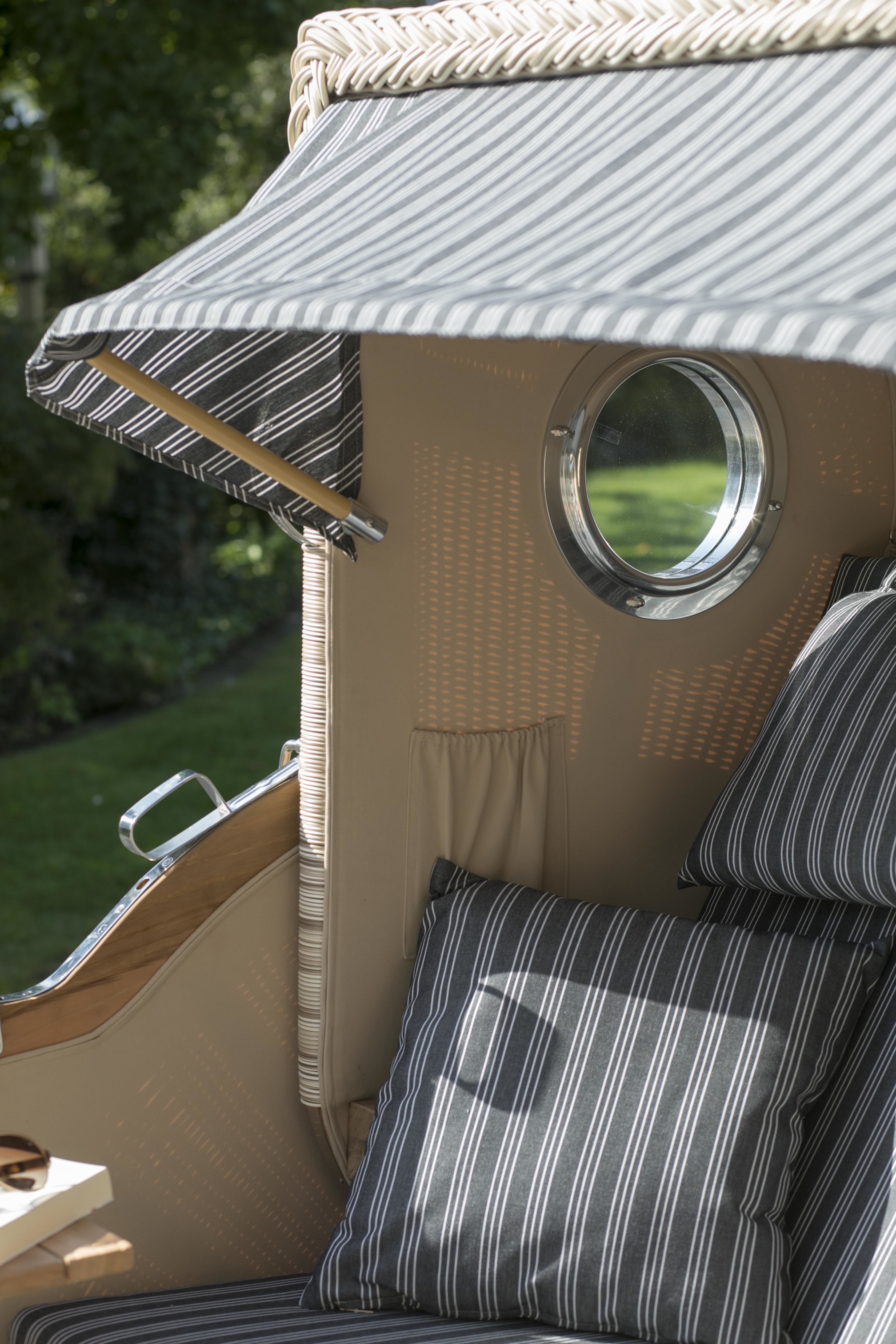 Wenn man einen Strandkorb aus Teak kaufen möchte, sollten gerade Komfort und Funktionalität im Vordergrund stehen. Der Strandkorb Düne ist ein eleganter Zweisitzer, der mit massivem Teakholz und einem edlen Polyrattan-Geflecht einen Hauch maritimer Ferienstimmung auf die Terrasse bringt. Das integrierte Tischchen und die Fußstütze mit bequemer Polsterung machen das Entspannen noch angenehmer. Mit dem Liftersystem kann die Lehne in verschiedene Liegepositionen verstellt werden. Der Strandkorb aus Teak bietet mit ausziehbaren Fußstützen, dicker Polsterung, Bullaugen und luxuriöser Ausstattung höchsten Komfort für gemütliche Stunden zu zweit.