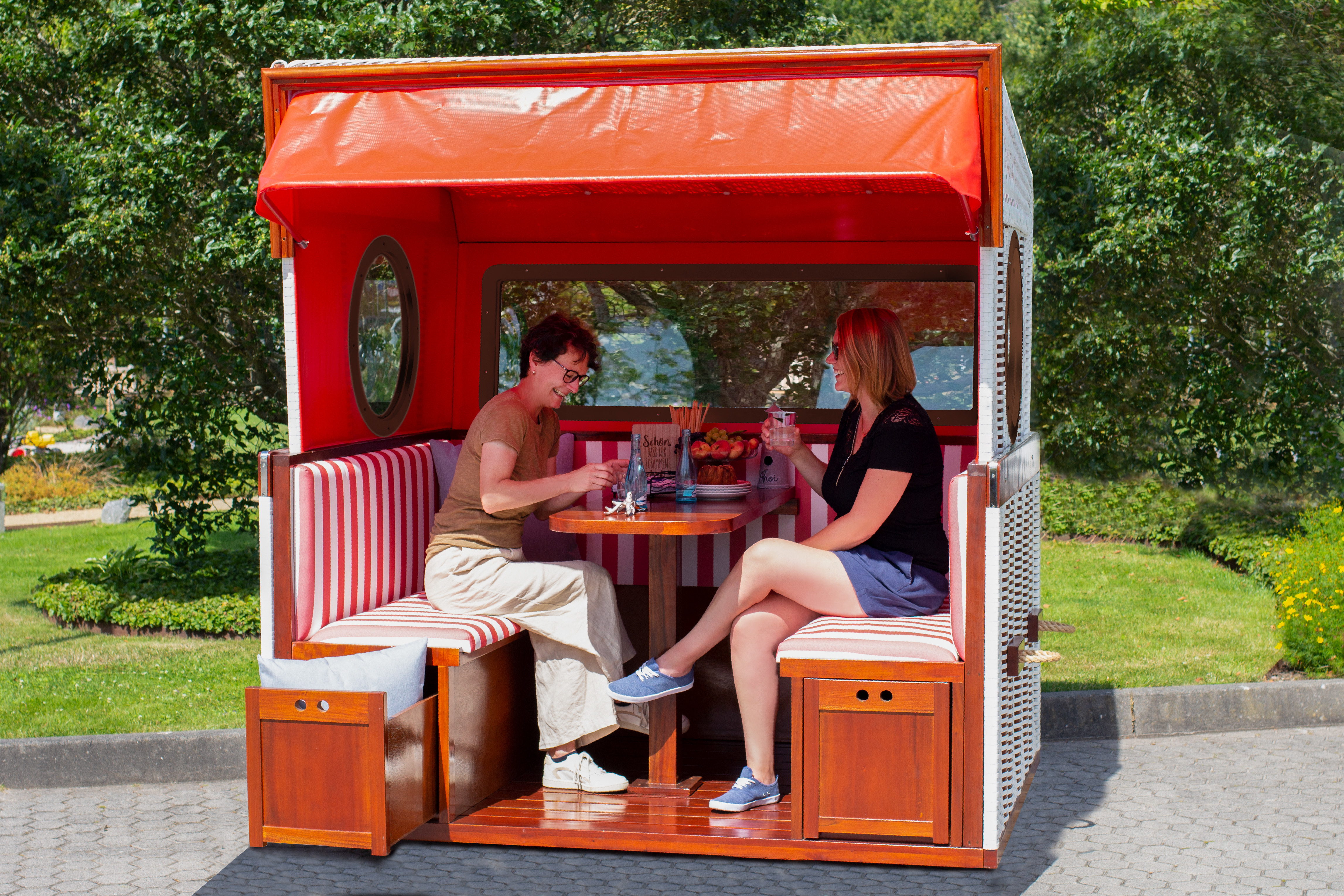 Der Strandkorb Gosch-Lounge eignet sich hervorragend für den Einsatz in der Gastronomie oder im Biergarten. Der hohe Sitzkomfort und das ansprechende Design macht ihn zu einem absoluten Blickfang. Dank des großen Tisches und der gegenüberliegenden Sitzbänke schafft die Lounge eine einladende Atmosphäre, ideal für gesellige Runden und Bierzelt-Gaudis.