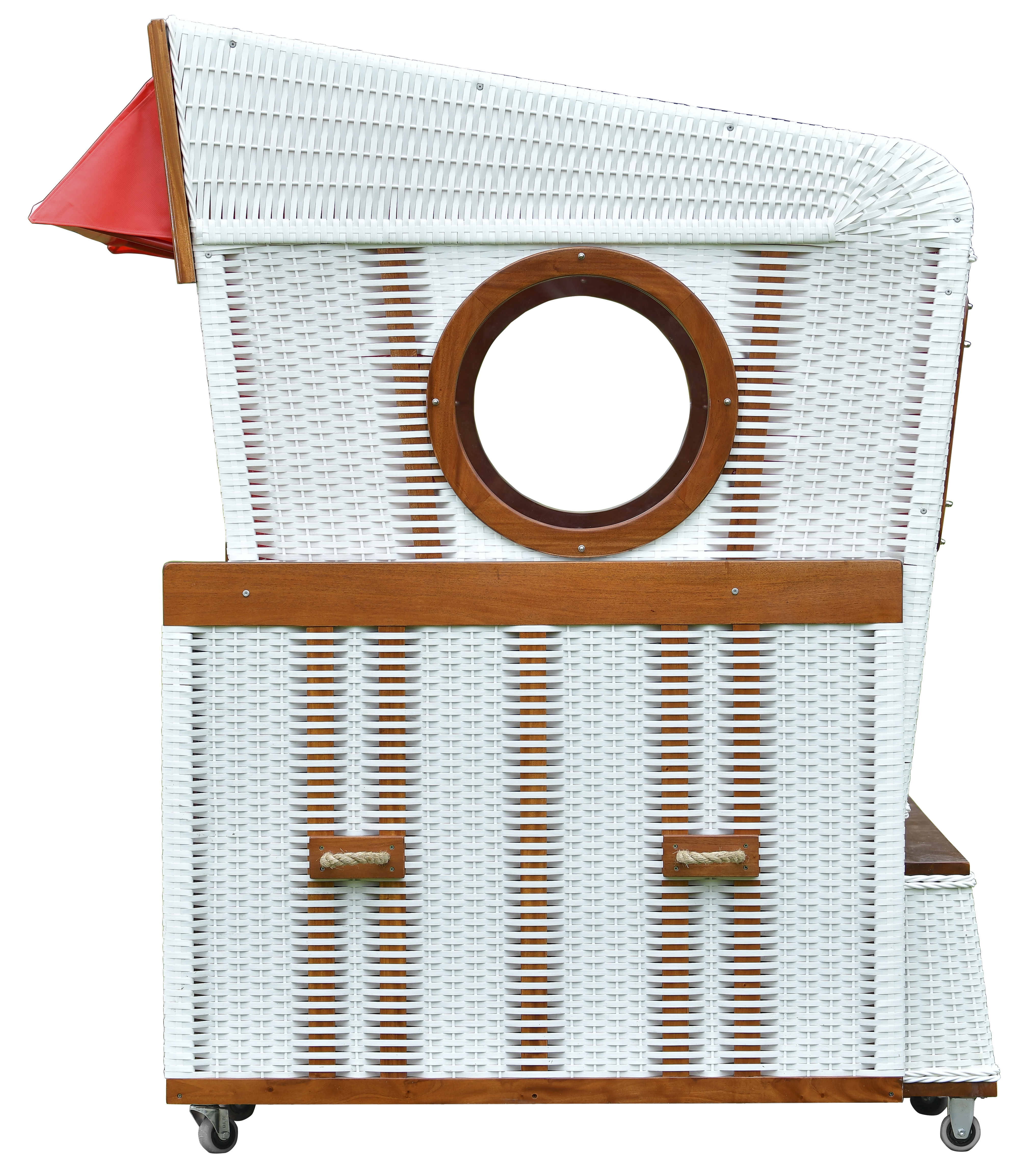 Der Strandkorb Gosch-Lounge ist ein exklusiver 6-Sitzer aus hochwertigem Mahagoni-Holz mit einem besonderen Design und strapazierfähigem PVC-Geflecht. Diese Lounge verleiht jeder Terrasse oder jedem Garten eine elegante Note. Mit zwei großen Bullaugen und einem Panoramafenster an der Rückseite sorgt sie für ein atemberaubendes Ambiente und eine besondere Aussicht.