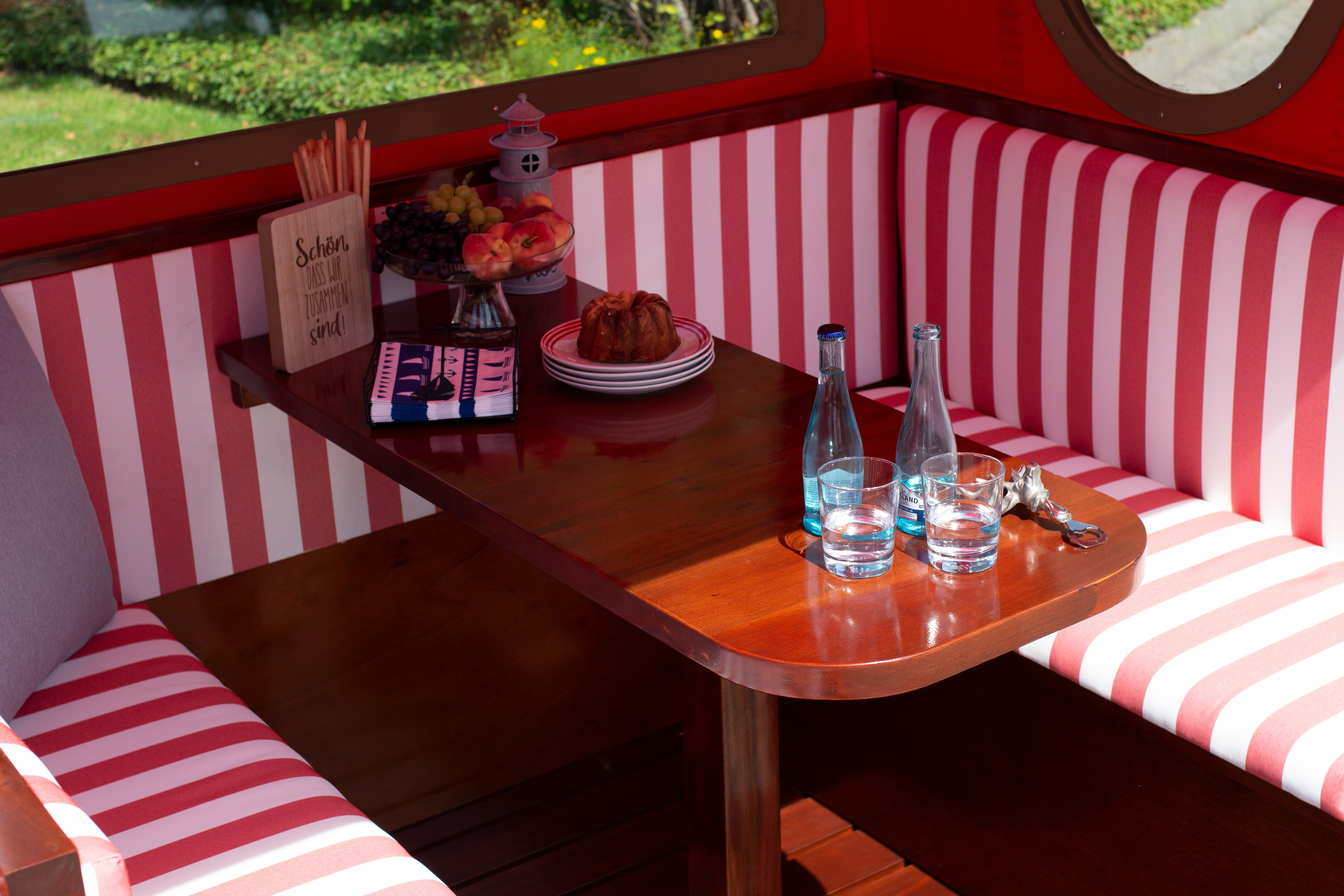 Zusätzlichen Komfort bieten zwei Schubkästen unter den Sitzbänken, die Platz für Getränke oder Zubehör wie Decken und Kissen bieten. Ein Stromanschluss ermöglicht es, Musik zu hören oder elektronische Geräte aufzuladen. Die zwei Sitzbänke bieten ausreichend Platz für gemütliches Beisammensein mit Freunden oder Familie, während der große Bistrotisch in der Mitte genügend Platz für Getränke und Speisen bereithält. Eine praktische Sonnenmarkise schützt vor zu viel Sonne und sorgt für angenehmen Schatten.