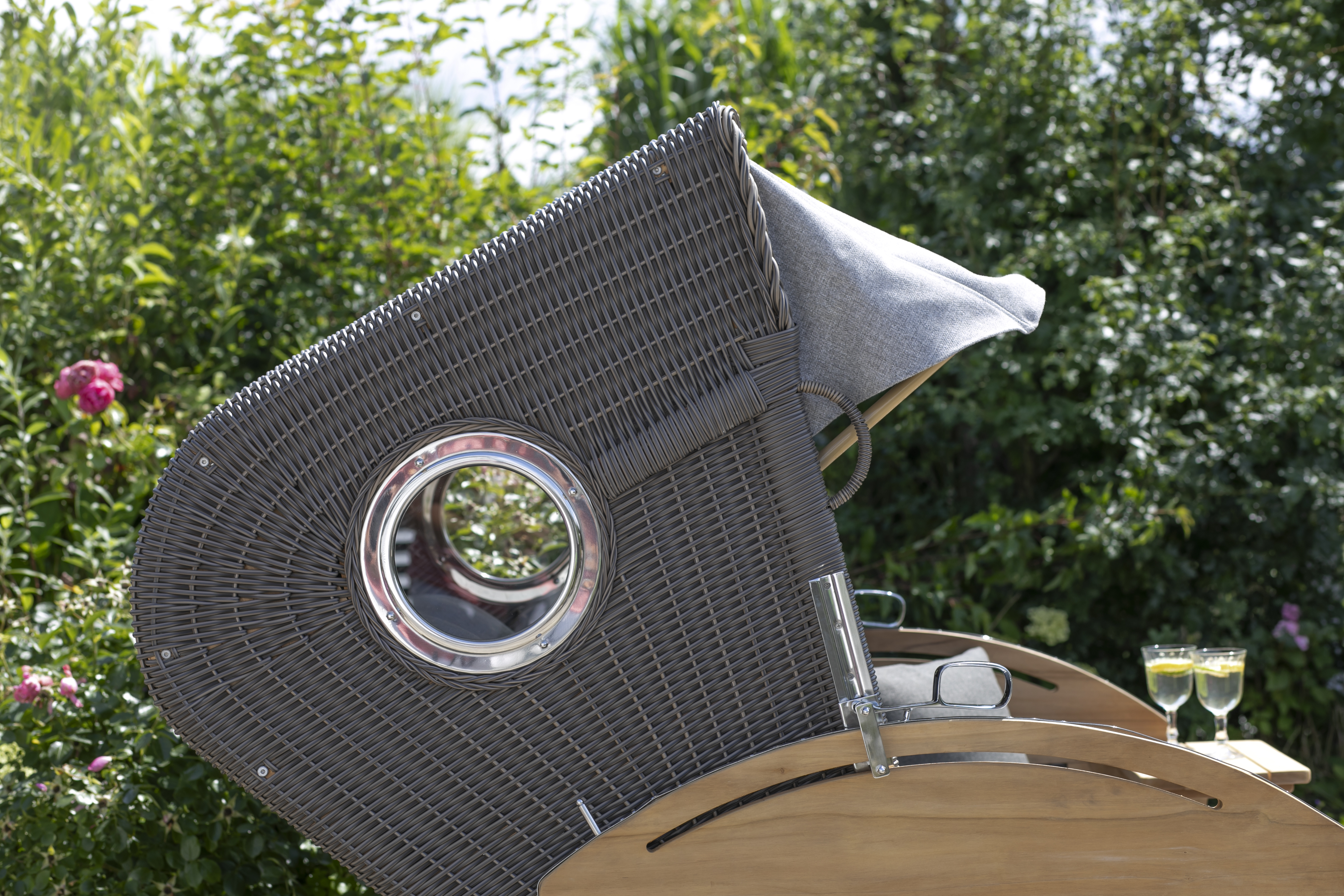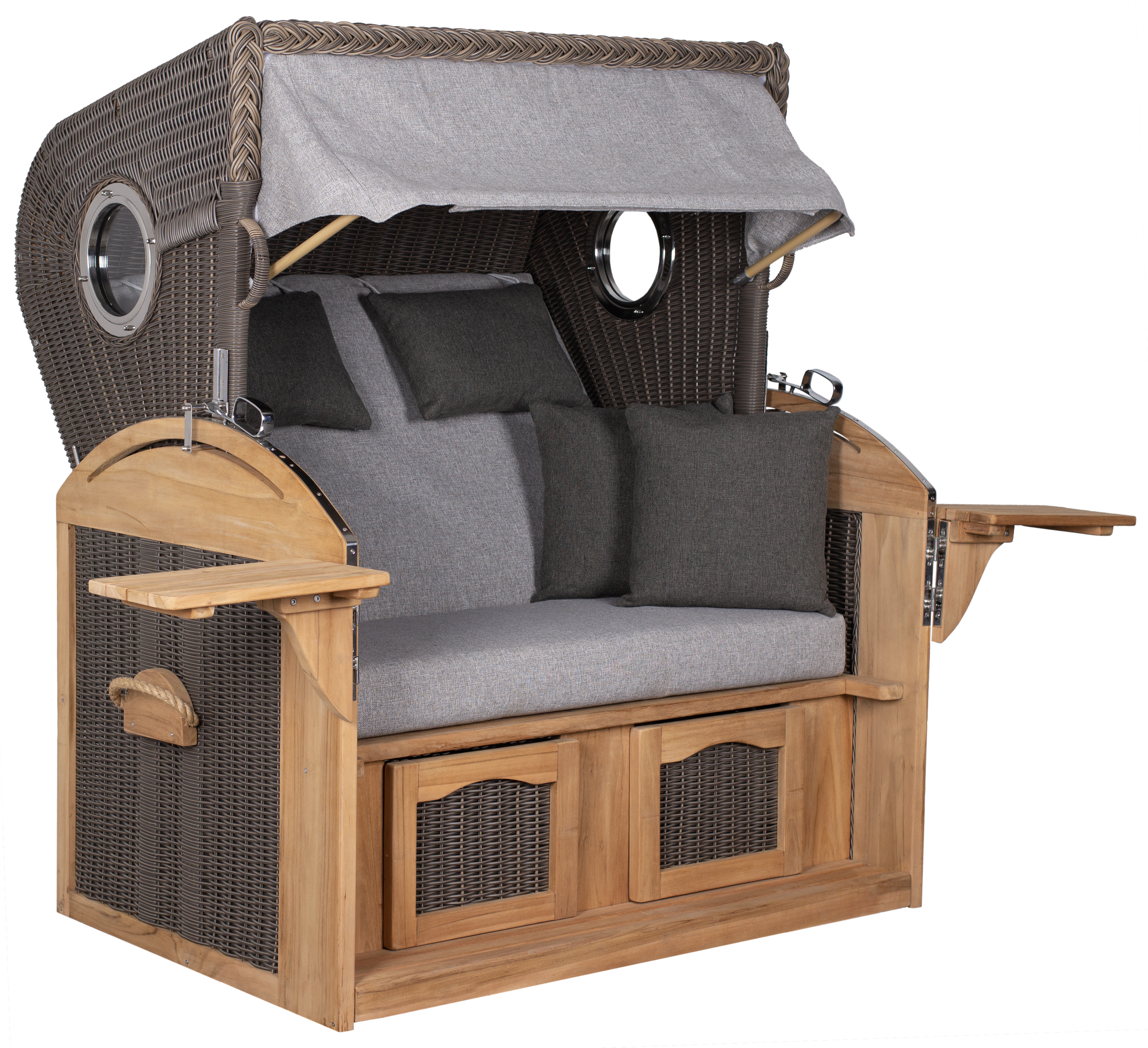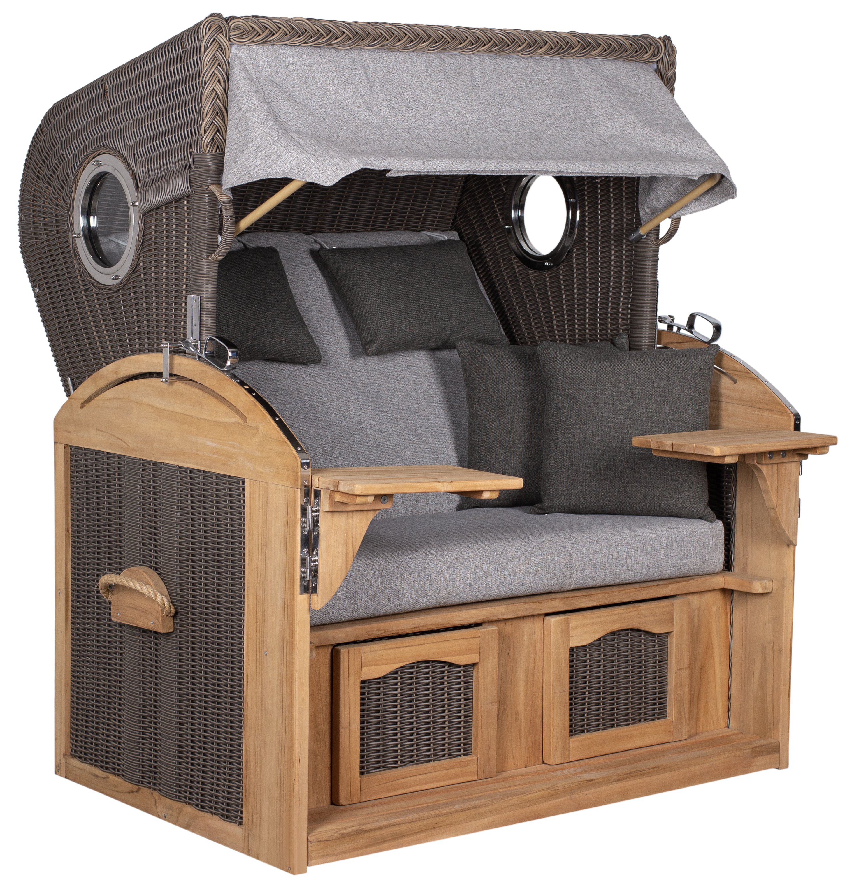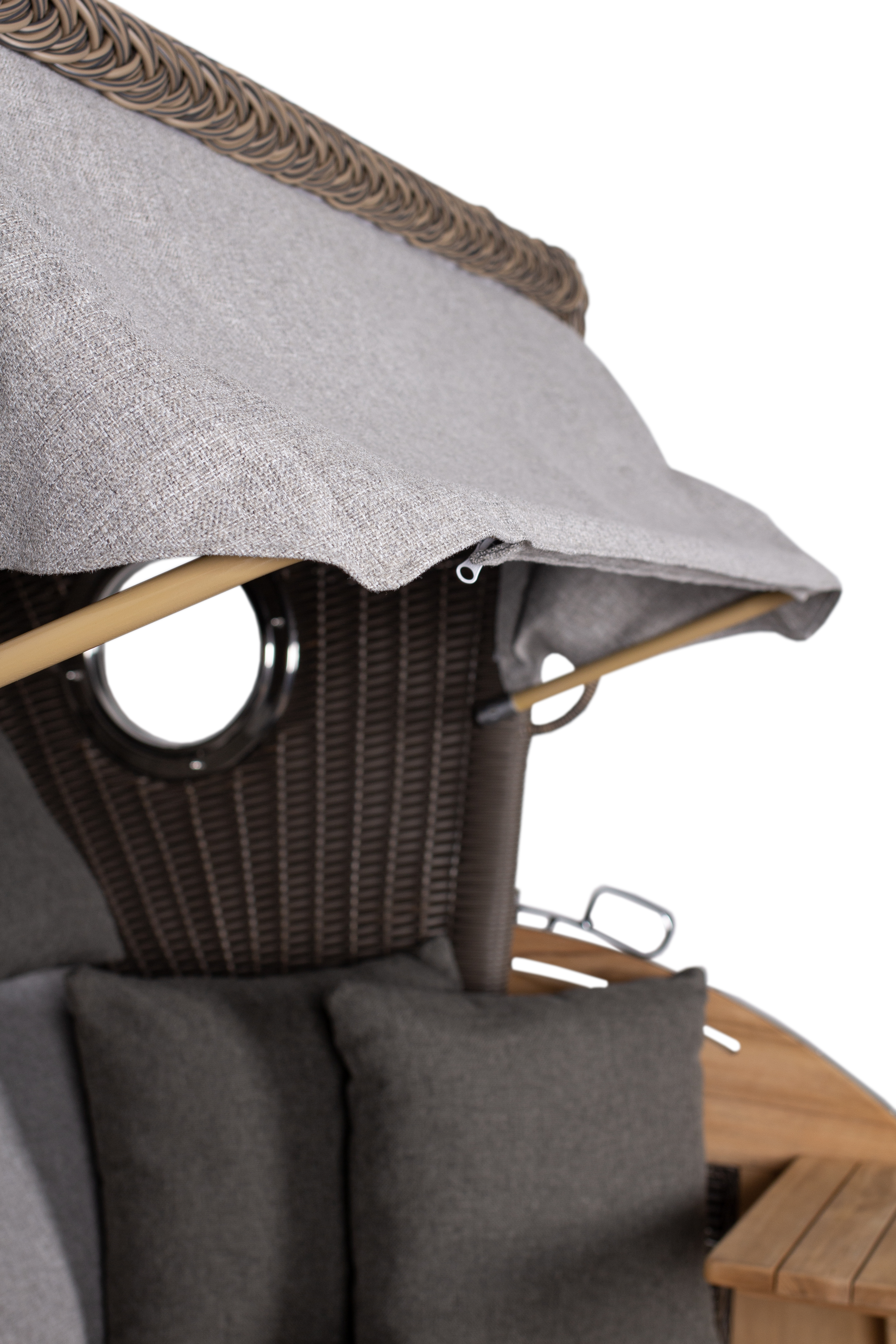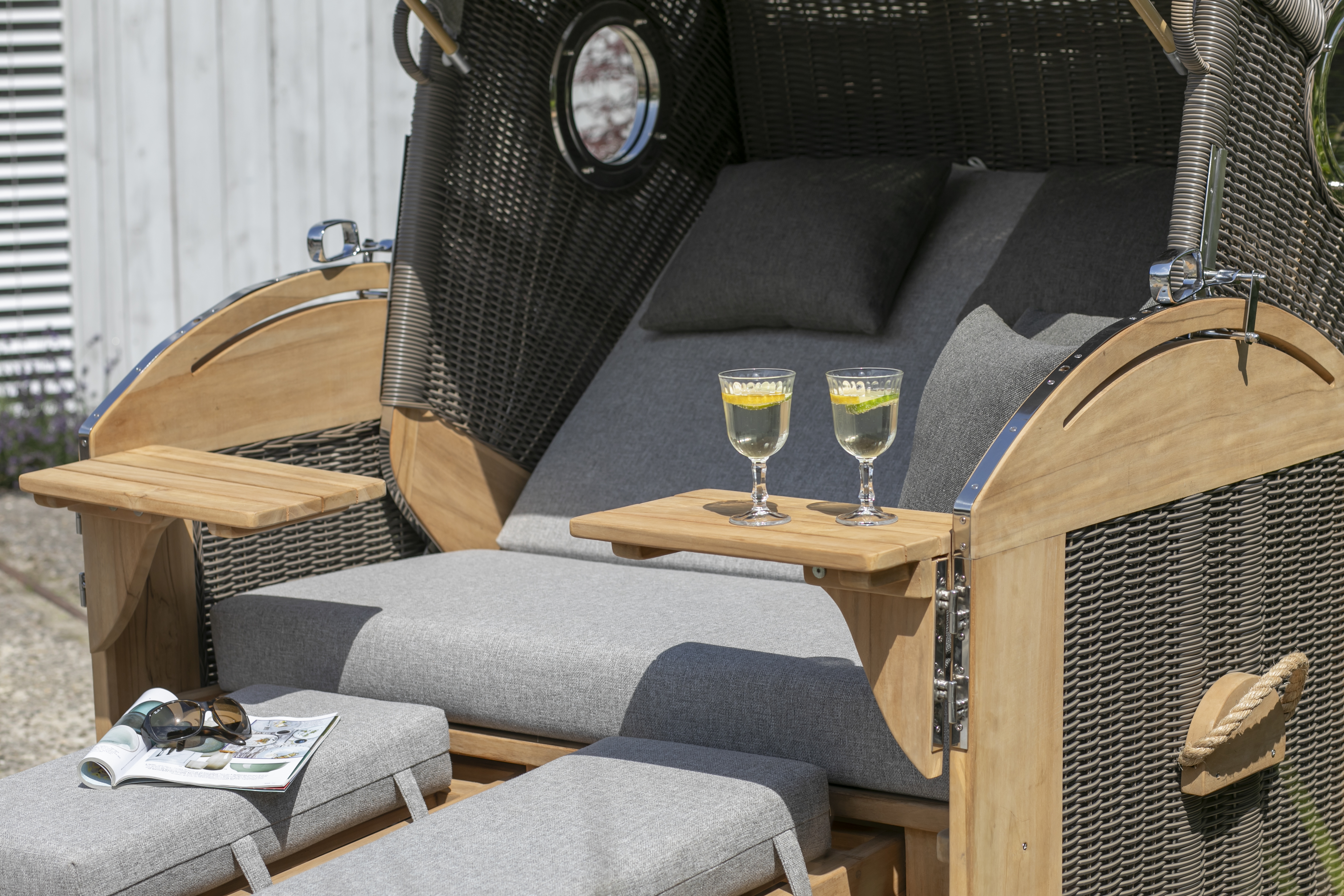 Mit extra dicker Polsterung (12 cm), ausziehbaren Fußstützen, Schwenktischen und Bullaugen bietet der Strandkorb Nordsee höchsten Sitz- und Liegekomfort. Dank des Liftersystems lässt sich der Oberkorb mühelos in verschiedene Liegepositionen verstellen. Eine innenliegende Windschutzfolie schützt vor Schmutz und Feuchtigkeit.