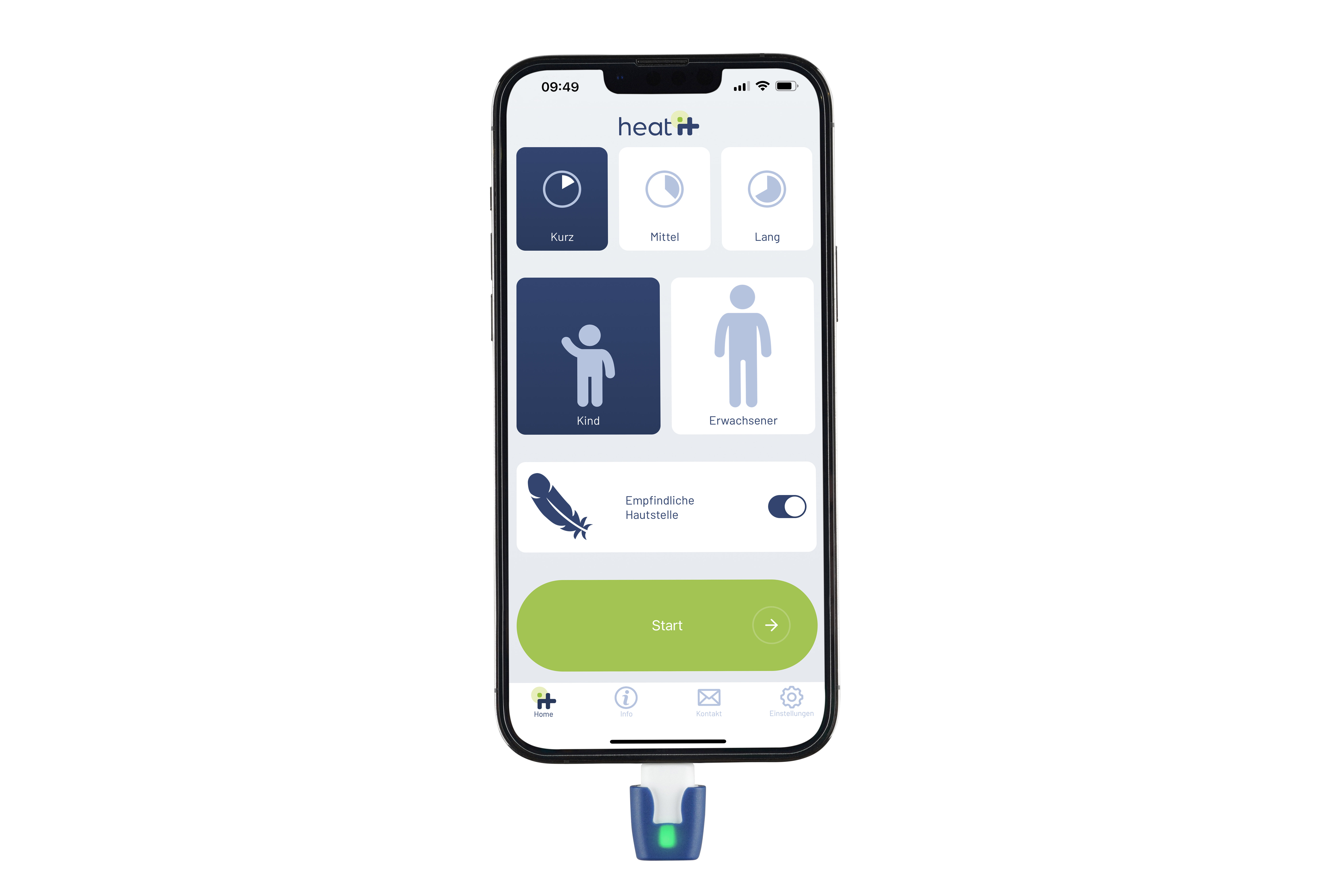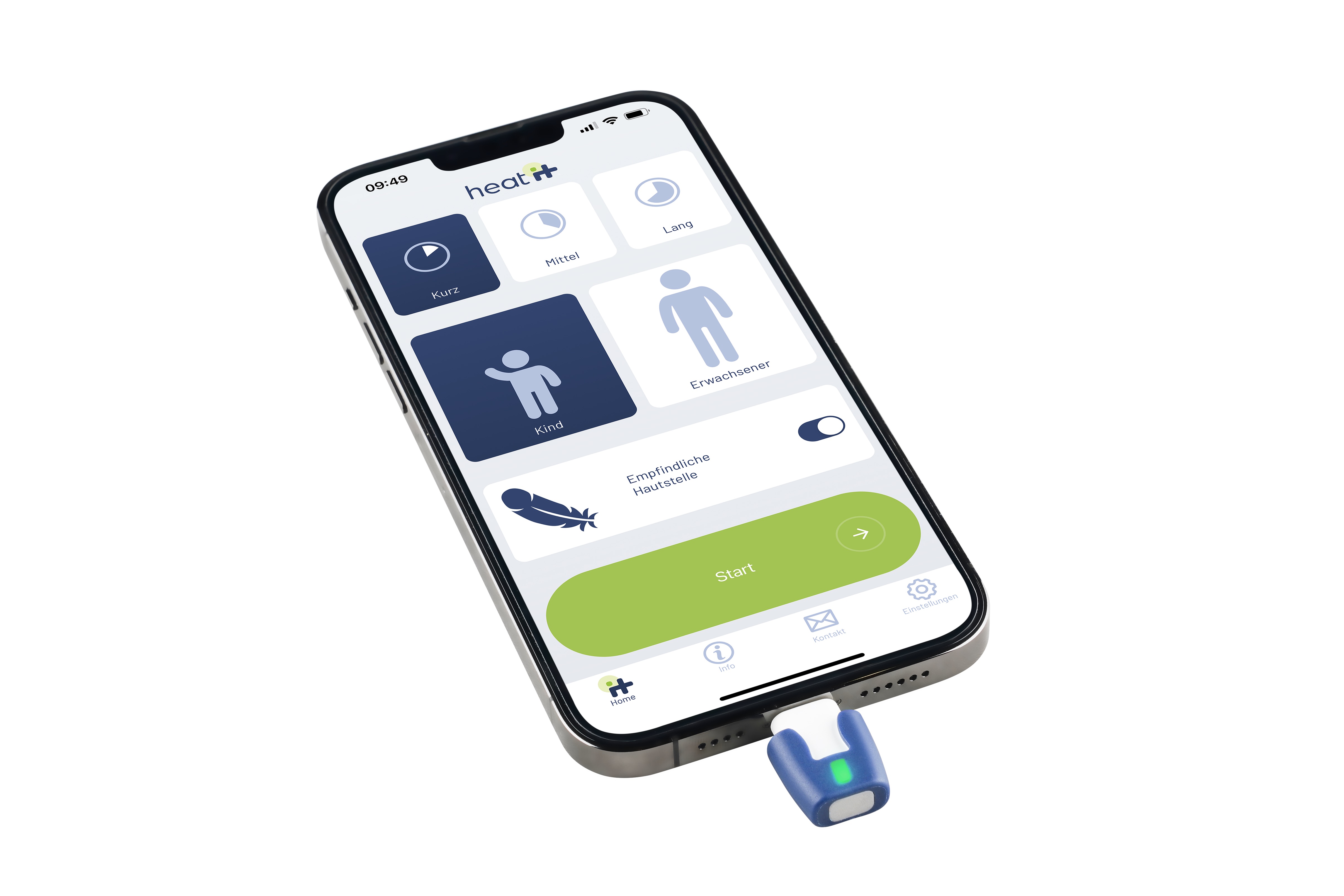 heat it® wird einfach in den Ladeanschluss des Smartphones eingesteckt, woraufhin sich die App automatisch öffnet. Nach dem individuellen Einstellen erwärmt sich die Kontaktfläche innerhalb weniger Sekunden und kann direkt auf den Stich aufgelegt werden.