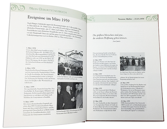 Darüber hinaus erfährt der Beschenkte beim Geburtstagsbuch kaufen viele weitere Begebenheiten aus Politik, Gesellschaft, Kultur und Sport rund um das Datum seines Geburtstags und aus den folgenden eineinhalb Jahrzehnten. So lässt sich in vielen emotionalen Bildern und informativen Texten die Zeit der Kindheit und Jugend noch einmal erleben.