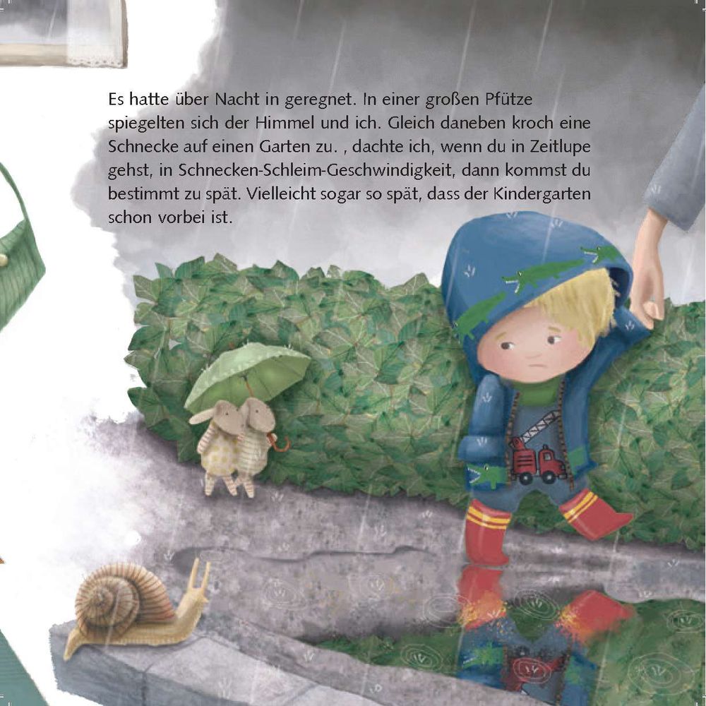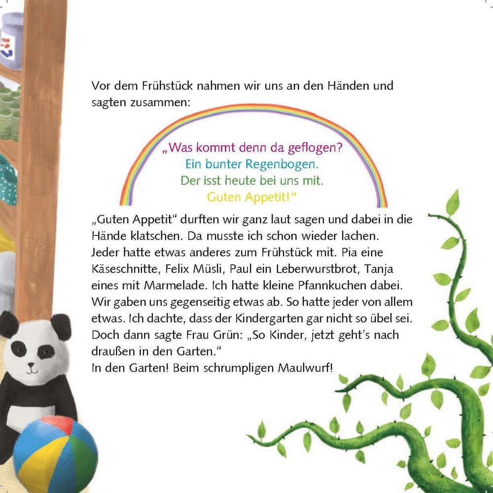 Schon die ersten Zeilen bringen Kinder und Eltern zum Schmunzeln: Was, wenn im Kindergarten wirklich Kinder eingepflanzt und gegossen werden? Doch schnell zeigt sich – dieser Ort steckt voller Bücher, Spielsachen, neuer Freundschaften und Abenteuer. Und ehe man sich versieht, wird aus Unsicherheit echte Vorfreude.