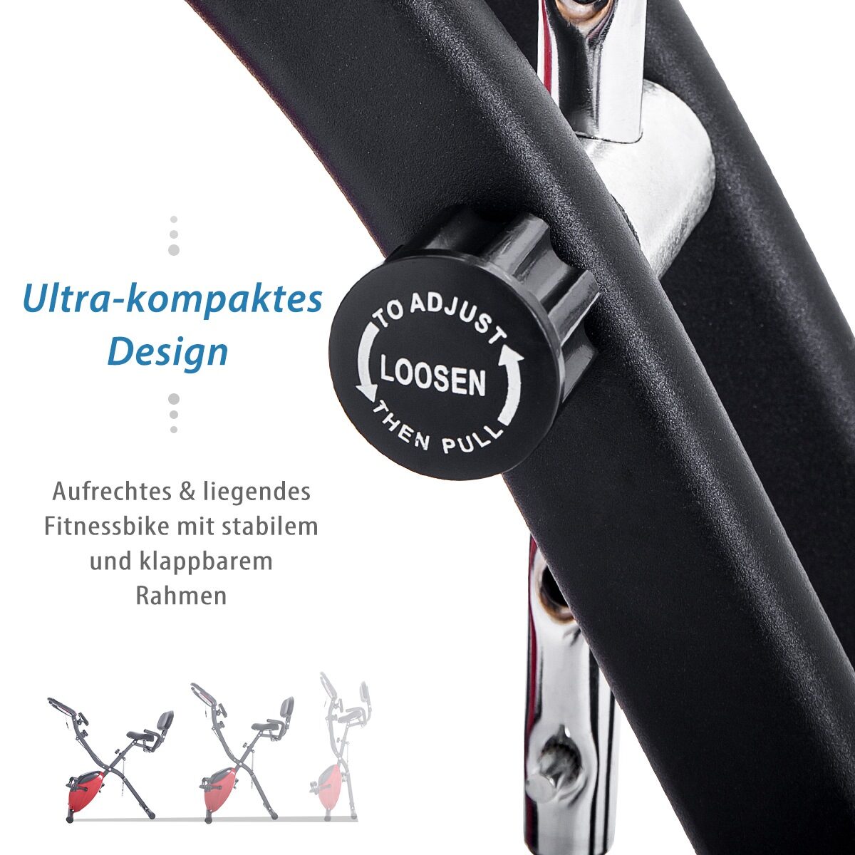 Das faltbare Fittnessfahrrad ist das perfekte Indoor-Trainingsgerät, das hilft, verschiedene Fitnessziele zu erreichen. Dieser innovative Heimtrainer bietet die Möglichkeit, zwischen aufrechter und liegender Radposition zu wechseln, sodass das Training individuell gestaltet werden kann. Dank des 4-in-1-Fitnessdesigns verwandelt sich das stehende Fahrrad mühelos in ein Liegerad und kann zusätzlich mit den integrierten Widerstandsbändern das Ganzkörpertraining maximieren.