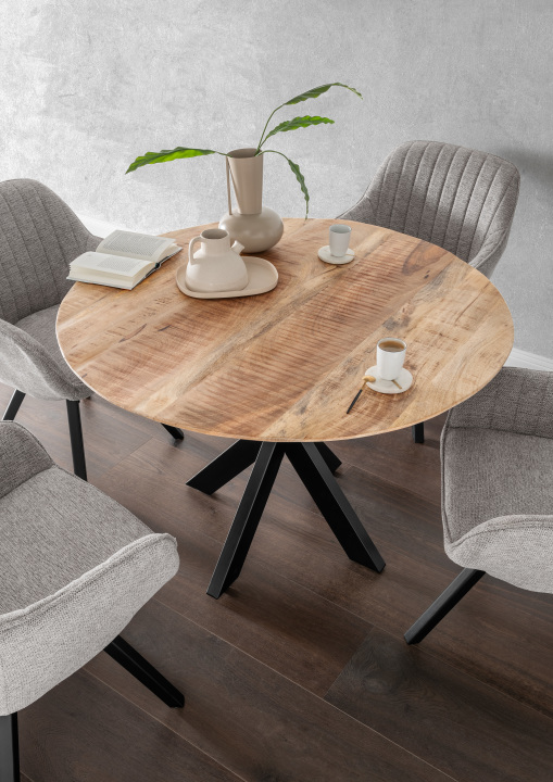 Der runde Tisch „Avola Mango“ mit einem Durchmesser von ca. 110 cm verbindet zeitloses Design mit Funktionalität und eignet sich perfekt für Esszimmer oder Wohnbereiche. Seine Tischplatte aus hochwertigem Mangoholz strahlt natürliche Wärme aus und bietet ausreichend Platz für gesellige Mahlzeiten oder entspannte Momente.