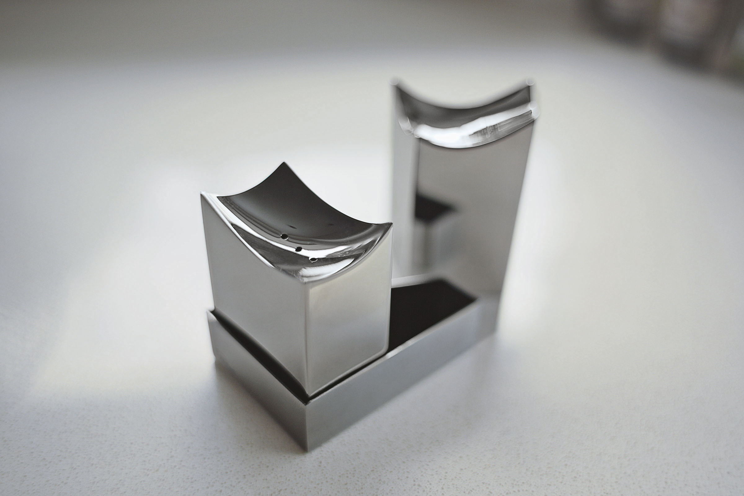 Die beiden Streuer wirken einzeln wie moderne Skulpturen, zusammen auf dem passenden Tablett arrangiert, formen sie eine Miniatur, die der berühmten Silhouette der Elbphilharmonie beeindruckend nahekommt.