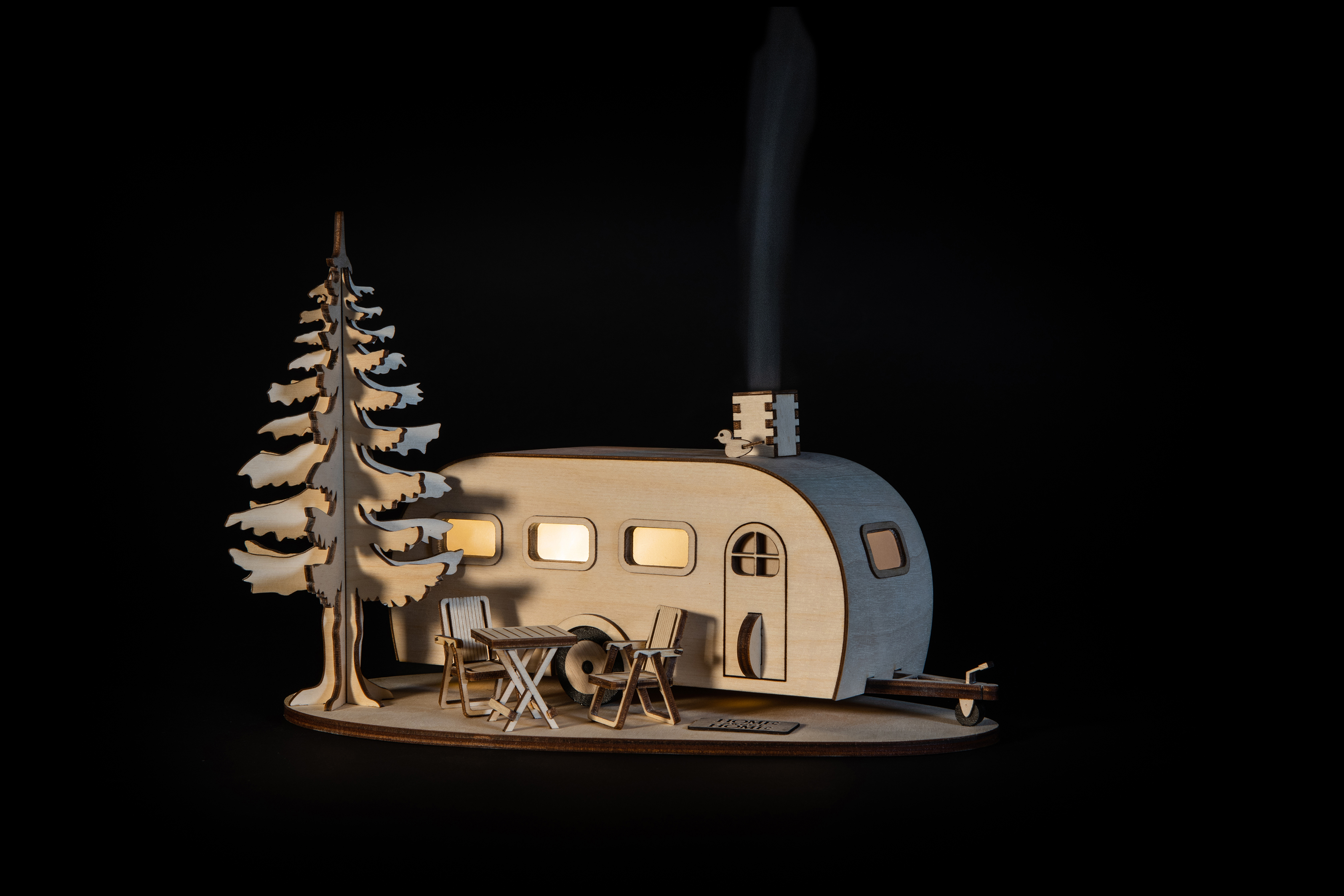 Durch die Kombination von Rauch und Licht hat dieser 1-Achser lang eine ganz besondere Wirkung. Das LED-Licht erhält man zusätzlich zu jeder Bestellung inklusive 2 x CR2032 Batterien. Ergänzt wird das Ensemble durch 2 Campingstühle und einem Tisch.