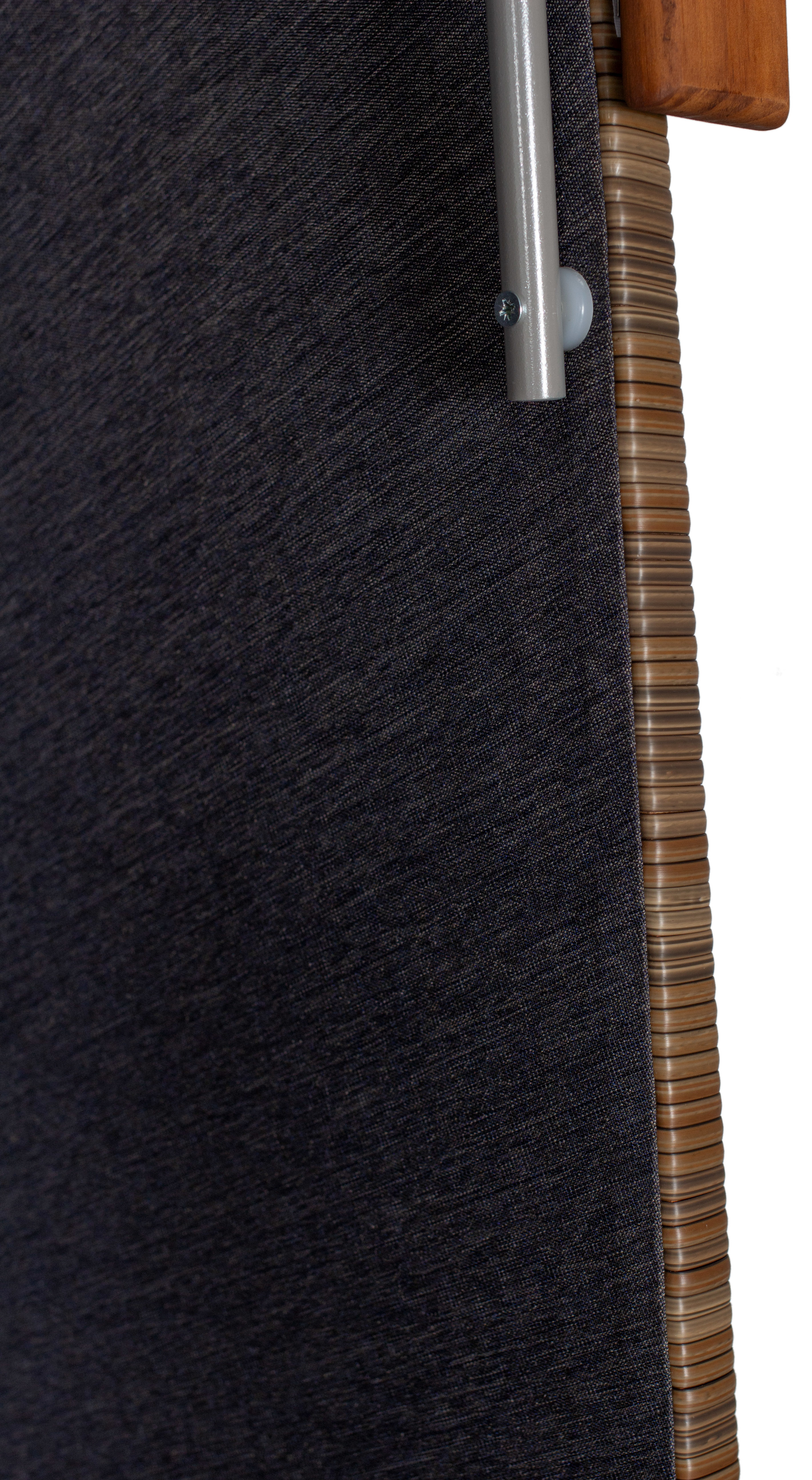 - Zertifiziertes Pinienholz, gebürstet / witterungs- und UV-beständiges PE-Flachgeflecht