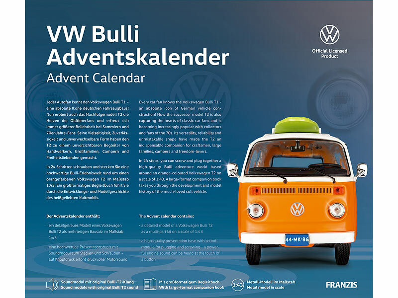 In 24 Schritten schrauben und stecken Sie eine hochwertige Bulli-Erlebniswelt rund um einen orangefarbenen Volkswagen T2 im Maßstab 1:43. Ein großformatiges Begleitbuch führt Sie durch die Entwicklungs- und Modellgeschichte des heißgeliebten Kultmobils.