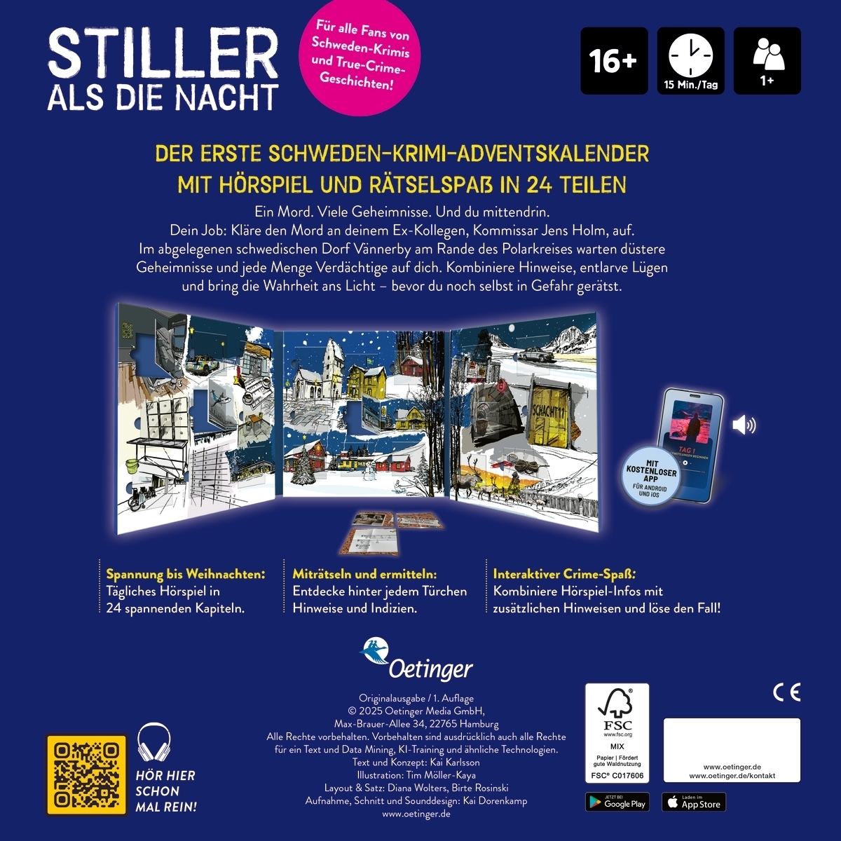 Analog trifft digital: Ein Adventskalender zum Aufstellen mit 24 Audio-Episoden im düsteren Schweden-Krimi-Setting.
