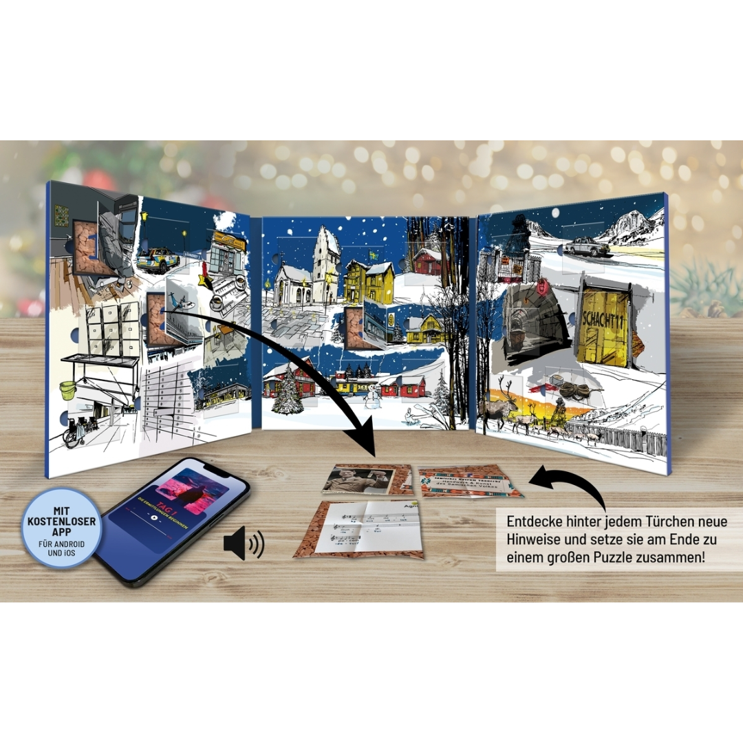 Toll ausgestattet: Der Adventskalender zum Rätseln besteht aus einem Aufstell-Adventskalender mit 24 Türchen mit Zettelchen und einem digitalen Hörspiel in 24 Teilen, das über eine kostenlose App abgerufen werden kann.