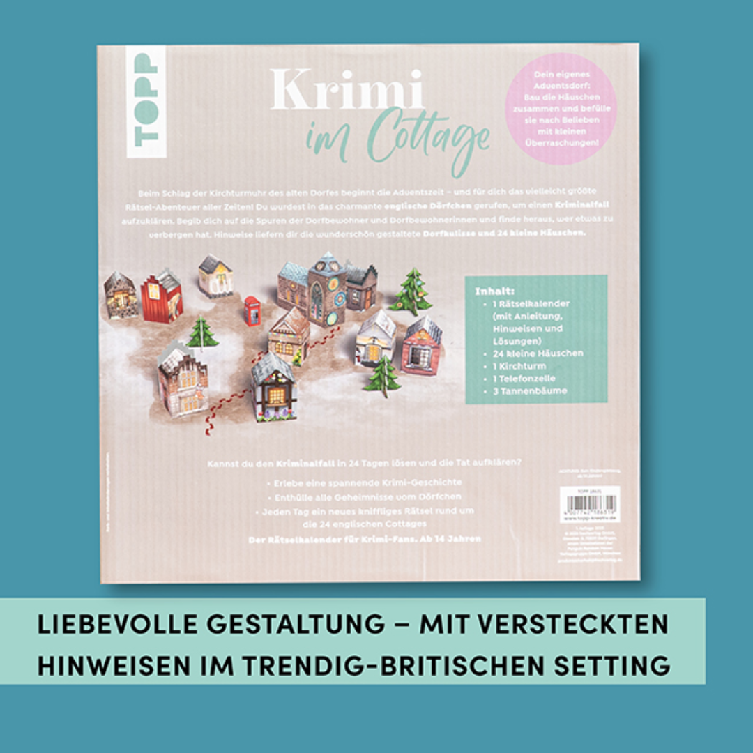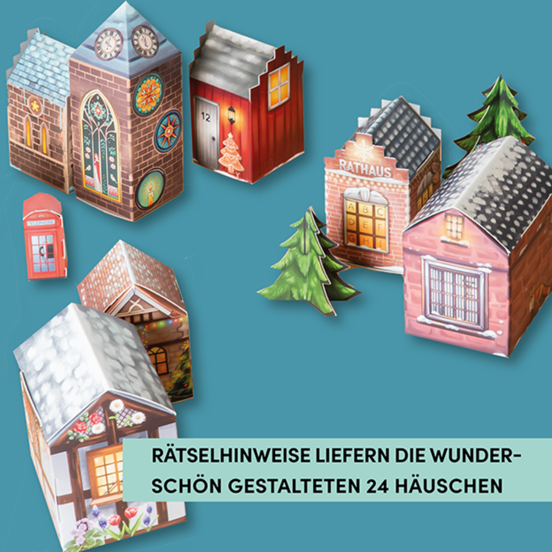 Beim Schlag der Kirchturmuhr des alten Dorfes beginnt die Adventszeit – und für dich das vielleicht größte Rätsel-Abenteuer aller Zeiten! Du wurdest in das charmante englische Dörfchen gerufen, um einen Kriminalfall aufzuklären. Begib dich auf die Spuren der Dorfbewohner und finde heraus, wer etwas zu verbergen hat. Hinweise liefern dir die wunderschön gestalteten 24 Häuschen. Dieser Adventskalender sorgt nicht nur bei eingefleischten Krimi-Fans für eine gemütliche Vorweihnachtszeit!