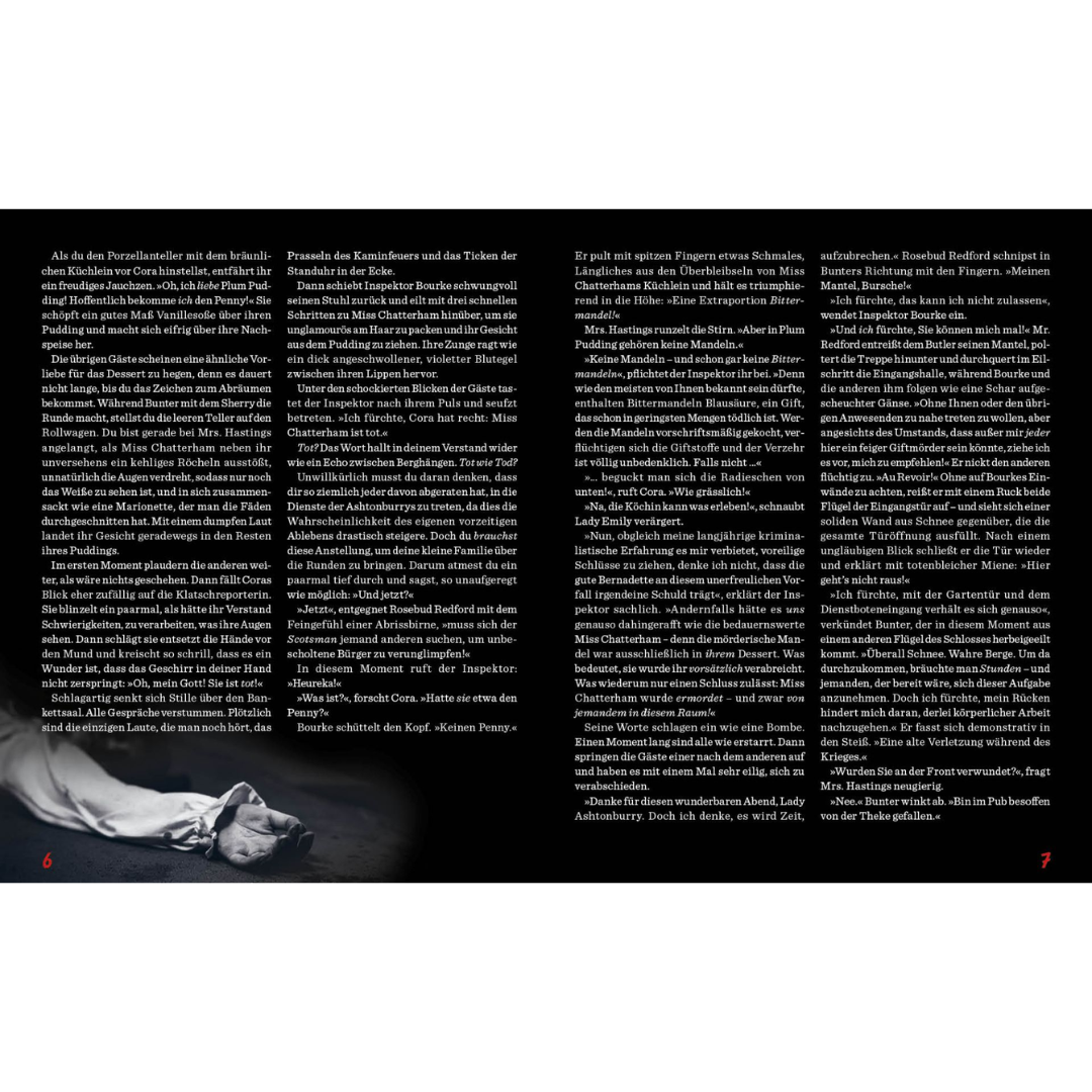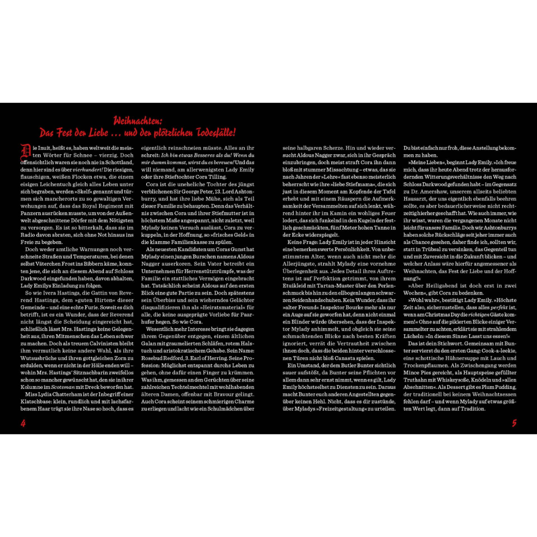 Bei dem diesjährigen Ashtonburry-Weihnachtsdinner soll nichts schiefgehen! Daher veranstaltet Mylady schon vorab ein Probedinner, doch das Dessert hat einen bittersüßen Beigeschmack, denn einer der Gäste landet mit dem Gesicht im Plum Pudding - dahingerafft von Blausäure! Da draußen ein Schneesturm tobt und niemand Schloss Darkwood betreten oder verlassen kann, scheint der Fall eindeutig: Am Tisch sitzt ein heimtückischer Giftmörder! Doch wer ist es und wird er erneut zuschlagen?
