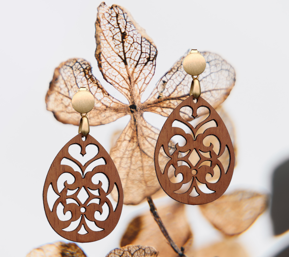 Dieses Schmuckset aus vergoldetem Sterlingsilber (925) und edlem Walnussholz, bestehend aus einer Halskette und passenden Ohrringen im Bohème-Stil, besticht durch seine zeitlose Eleganz. Es strahlt eine feine, anmutige Schönheit aus und unterstreicht die natürliche Ausstrahlung seiner Trägerin. Das Waidzeit-Set ist zudem ein wundervolles Geschenk für Damen. Die Verpackung erfolgt umweltfreundlich und plastikfrei in einer stilvollen Holzschatulle.