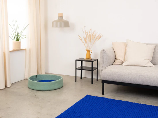 Der handgefertigte Hundekorb aus reiner Schurwolle bietet kleinen und großen Hunden ein Gefühl von Geborgenheit. Erhältlich in den Durchmessern 40 cm oder 60 cm und in drei Farben sowie jeweils zwei verschiedenen Inlays, ermöglicht er zahlreiche Farbkombinationen. Dank des nachhaltigen Materials und des natürlichen Wollfetts ist der Hundekorb pflegeleicht, antibakteriell und reguliert die Temperatur. Dadurch bietet er im Winter eine warme und gemütliche Atmosphäre und im Sommer angenehme Kühle.