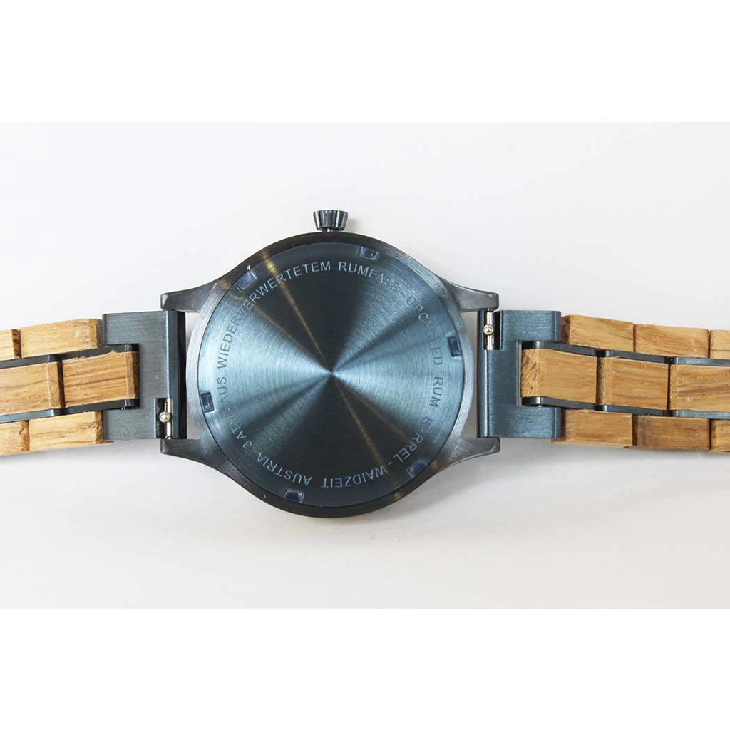 Durch die aufwendige Einarbeitung des Rumfasses im Ziffernblatt, dem Uhrengehäuse und dem Armband trägt diese Holzarmbanduhr die Seele des Rums in sich. Die Farbkombination aus warmen Eichenfassholz mit blauem Edelstahl ist besonders schön und edel. Ein idealer Begleiter für den Alltag aber auch für besondere Anlässe.