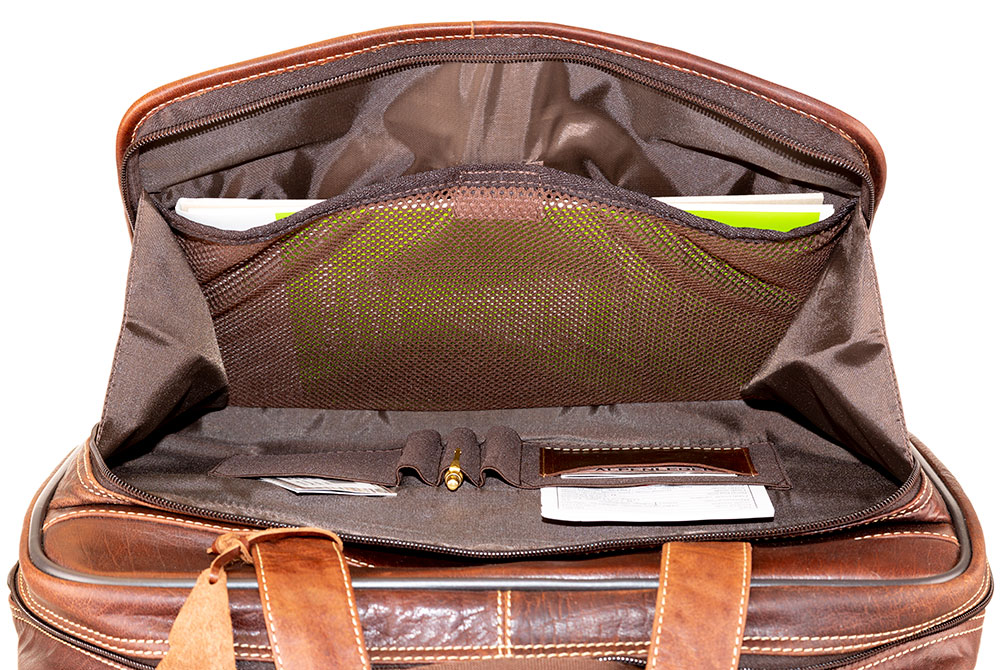 Auf der Vorderseite besitzt die Aktentasche Denver ein aufgenähtes Reißverschlussfach. Ein kleineres Reißverschlussfach für Stifte, Visitenkarten und ein Tablettfach. Zwei geräumige Hauptfächer die alle durch einen Reißverschluss zugänglich sind Im Vorderen Hauptfach ist eine extra entnehmbare Laptoptasche, wo sich ein ca. 38x28 cm großer Laptop oder Netbook verstauen lässt. Im selbigen Fach können auch Kleidungsstücke sicher verstaut werden für eine kleine Reise z.B. ein Hemd und ein T-.Shirt. Im zweiten Hauptfach ist Platz für einen DIN A4 Ordner und alle notwendigen Bürounterlagen. Ein Reißverschluss, unter dem sich das Trolley-Gestänge verbirgt ist auf der Rückseite angebracht.. Die Innenseite des Trolley ist komplett mit einem reißfestem Nylonfutter ausgestattet. Griffhöhe bei ausgezogenem Gestänge 100 cm.