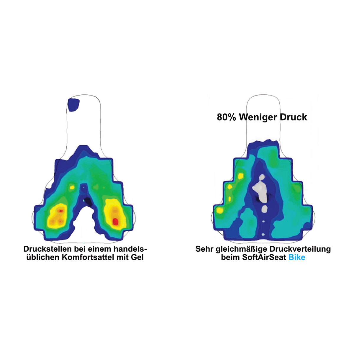 Der Sattelüberzug besteht aus einem sehr robusten, neu entwickelten TPU-Lycra Material aus Süd-Korea. Durch die einmalige, patentierte Funktion kann die Luft zwischen den unterschiedlichen Polster-Segmenten hin und zurück Strömen. Hierdurch wird das Gewicht optimal auf die Tretbewegung verteilt. Die Sitzhöcker und das Steißbein, sowie der Dammbereich wird entlastet.