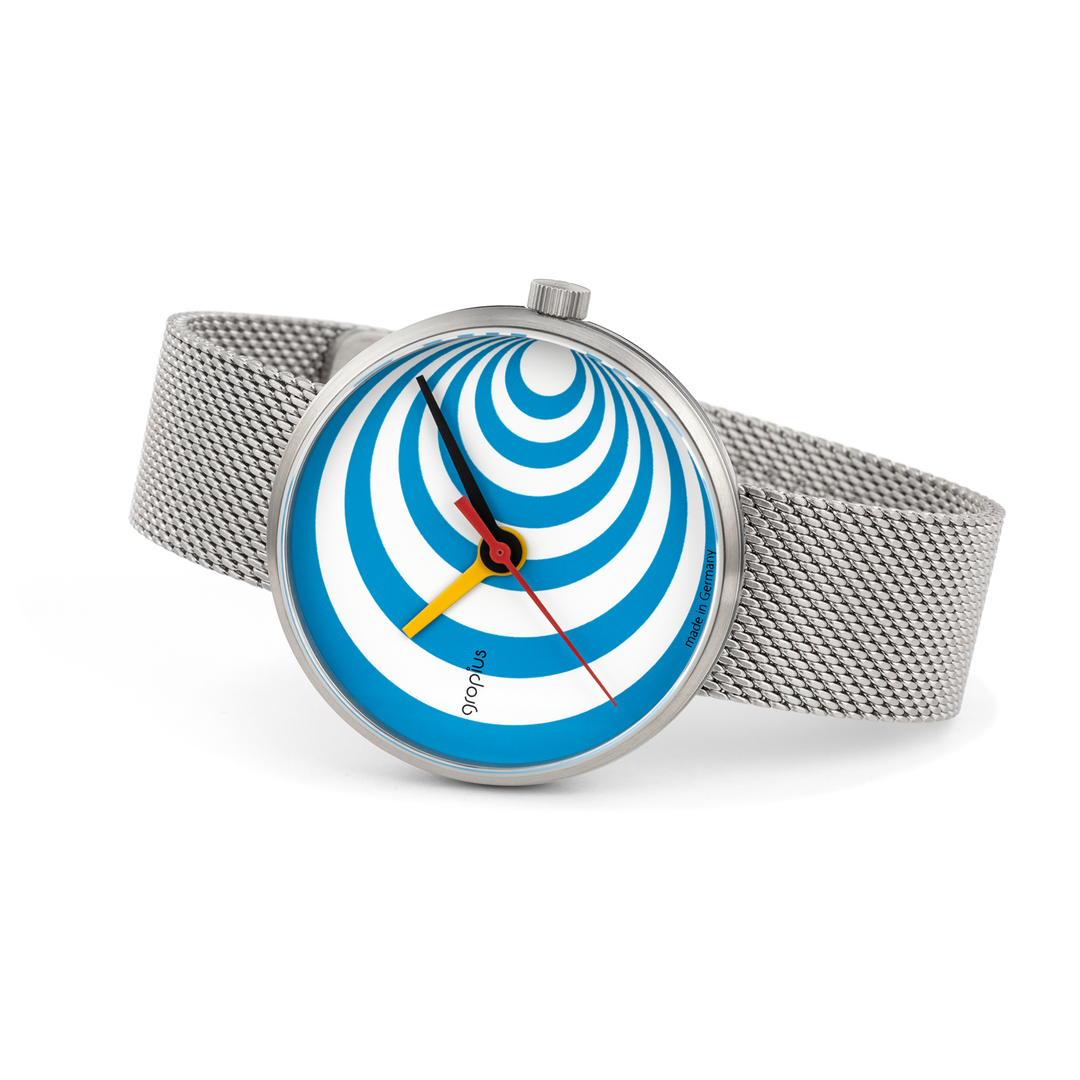 Das Design orientiert sich an den grafischen Fotografien von László Moholy-Nagy sowie den Farbkompositionen von Josef Albers und nimmt Bezug auf die ikonische Wendeltreppe der Bauhaus-Universität Weimar. Das präzise Uhrwerk trifft auf eine minimalistische Formsprache, die das Bewusstsein für Zeit neu definiert und ein freieres Zeitempfinden ermöglicht.