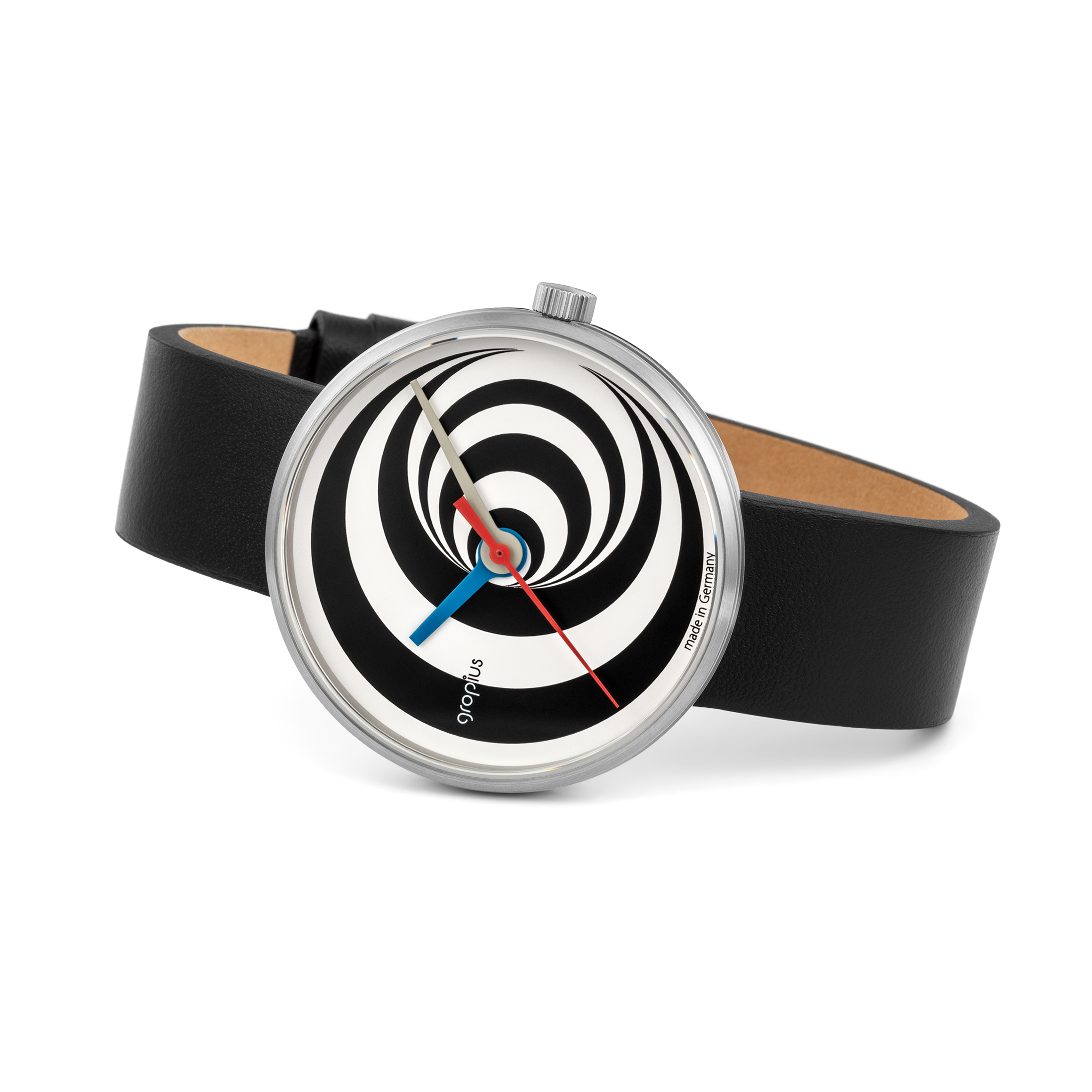 Das Design nimmt Bezug auf die grafischen Werke von László Moholy-Nagy und die Farbtheorien von Josef Albers und erinnert mit seinem Ziffernblatt an die ikonische Wendeltreppe der Bauhaus-Universität Weimar. Ein präzises Uhrwerk, kombiniert mit der schlichten Eleganz des schwarzen Armbands und Ziffernblatts, verleiht der Uhr eine zeitlose Raffinesse.