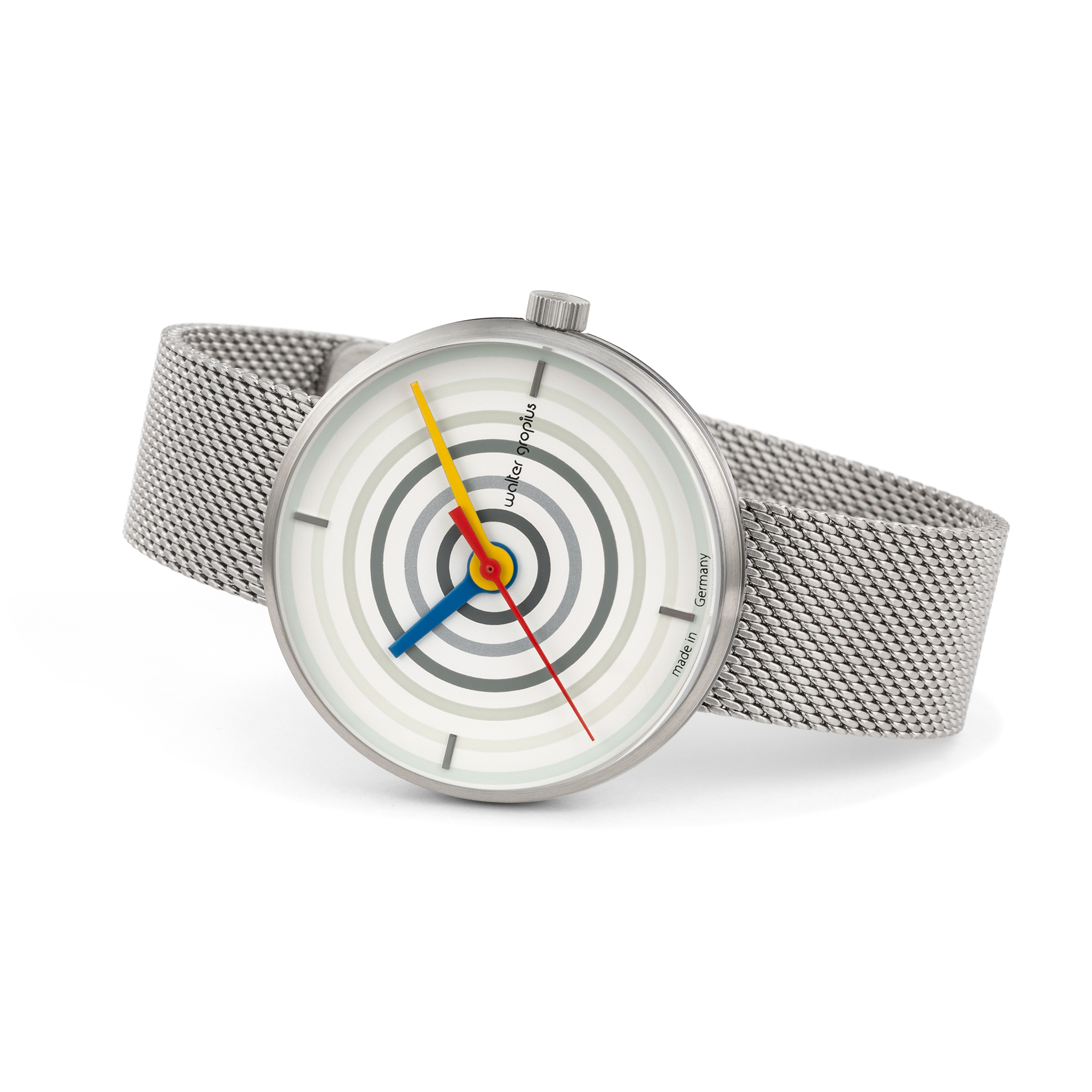 Die Walter Gropius Bauhaus Space Loops Uhr mit Edelstahlarmband kombiniert minimalistisches Design mit einer klaren Hommage an die Bauhaus-Bewegung. Das graue Ziffernblatt zeigt konzentrische Kreise und ein faszinierendes Farbschema mit gelben, blauen und roten Zeigern, das einen markanten Akzent setzt. Der präzise gefertigte Edelstahlgehäuse-Rahmen umschließt das Design und sorgt für sowohl Robustheit als auch Eleganz.