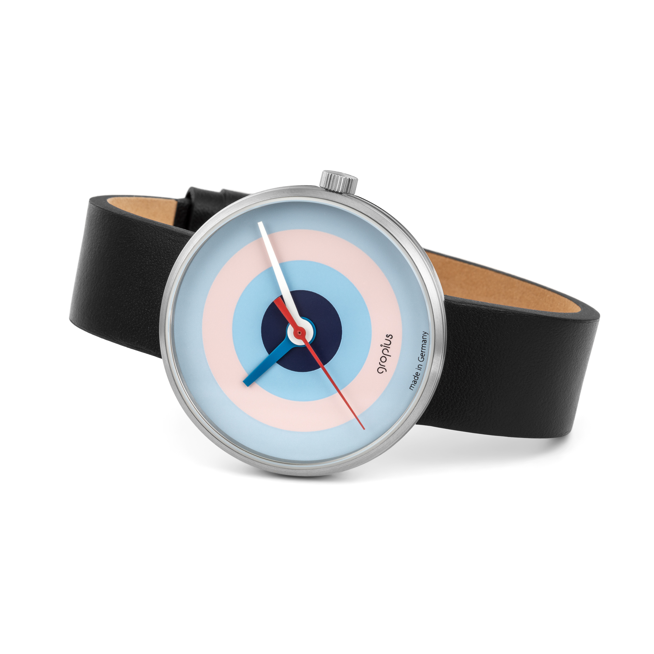 Die Walter Gropius Bauhaus J. Albers Uhr mit schwarzem Lederarmband und einem Ziffernblatt in Blau und Rosa vereint moderne Ästhetik mit der klassischen Bauhaus-Philosophie. Inspiriert von Josef Albers, einem bedeutenden Maler und Kunsttheoretiker, verfolgt diese Uhr das Ziel, das Bewusstsein für die Zeit zu schärfen und ein freieres Zeitempfinden zu ermöglichen. Das Ziffernblatt ist kunstvoll mit konzentrischen Kreisbahnen verziert und kombiniert Blau und Rosa in einer faszinierenden Farbgebung. Das robuste Edelstahlgehäuse und das kratzfeste Uhrenglas sorgen für Langlebigkeit und schützen das präzise Quarzwerk.