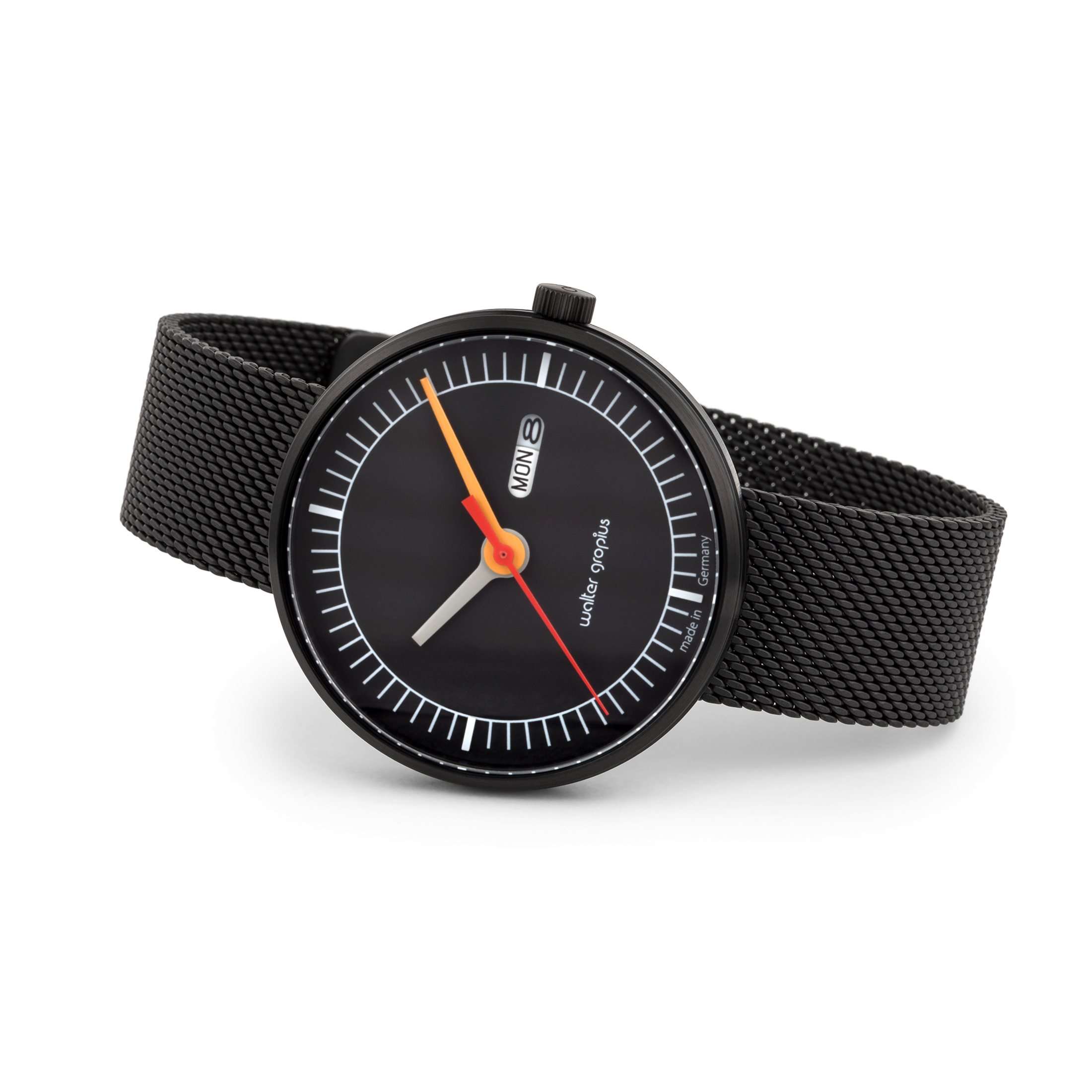 Die Walter Gropius Classic Date Uhr vereint minimalistisches Design mit funktionaler Eleganz und spiegelt den Bauhaus-Stil wider. Das tiefschwarze Ziffernblatt bildet einen starken Kontrast zu den schlichten weißen Stundenmarkierungen und den Zeigern in den klassischen Primärfarben Rot, Gelb und Orange. Dies sorgt für eine klare Ablesbarkeit und verleiht der Uhr gleichzeitig einen modernen, dynamischen Charakter. Ein praktisches Detail ist die Datumsanzeige, die Tag und Datum auf einen Blick zeigt.