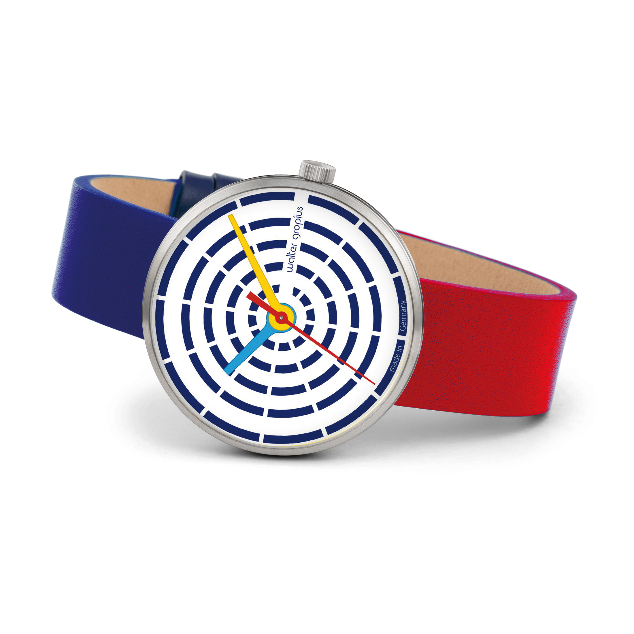 Die Space Loop Limited Edition aus der Walter Gropius Kollektion kombiniert avantgardistisches Design mit hochwertiger Handwerkskunst. Ihr einzigartiges Ziffernblatt in Weiß wird von roten und blauen gestrichelten Kreisen geziert, die eine faszinierende optische Tiefe erzeugen. Ergänzt wird das Design durch bunte Zeiger, die einen kreativen Farbakzent setzen.