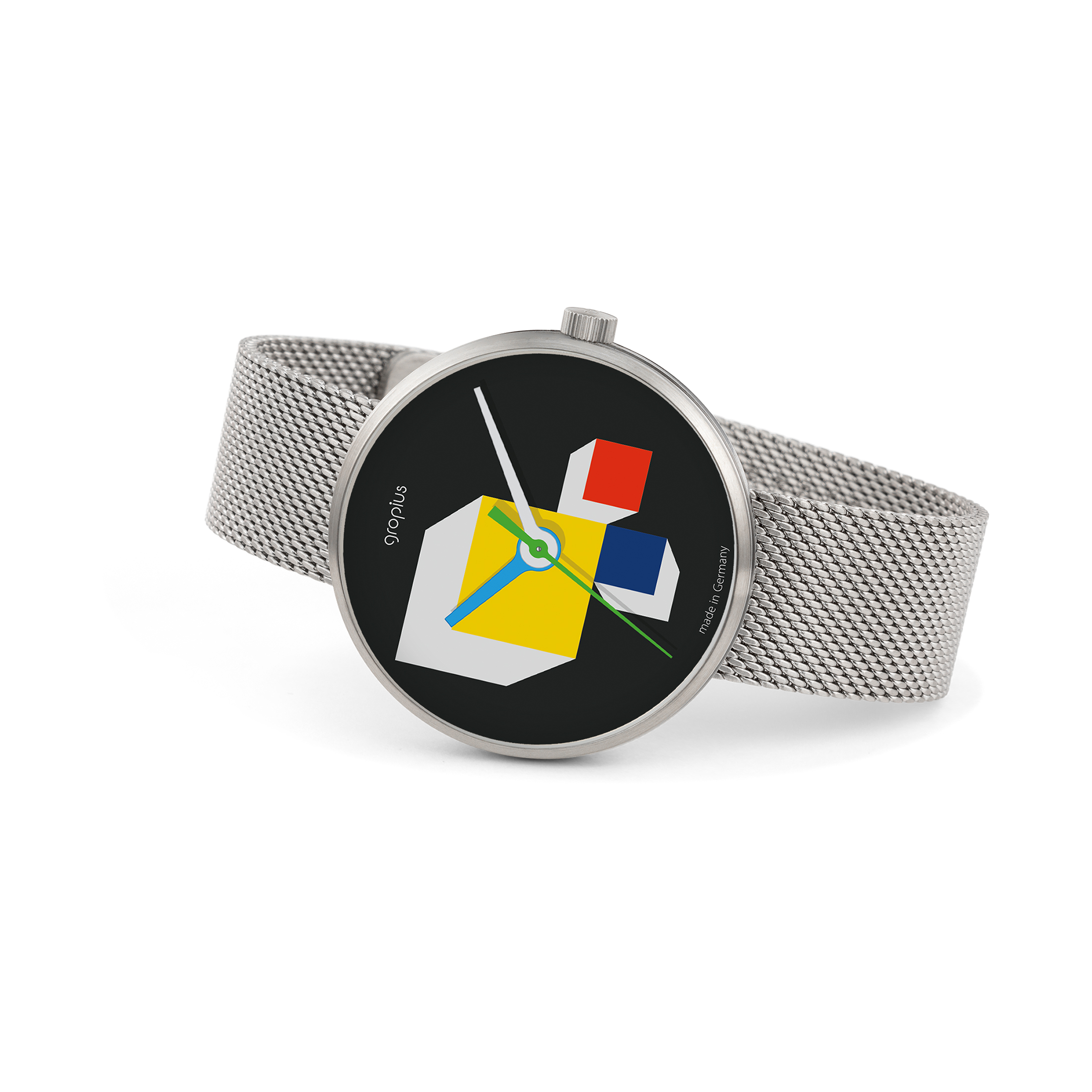 Inspiration für diese Kollektion, genannt HAUSBAUHAUS, war der Einband der Bauhausbuchreihe „Bauhausbücher“, die von Walter Gropius und László Moholy-Nagy herausgegeben wurde. Das Design der Uhr spiegelt die architektonischen Elemente des Bauhauses in Weimar wider und repräsentiert Einblicke, Ausblicke und Durchblicke durch Farb- und Formenlehre.