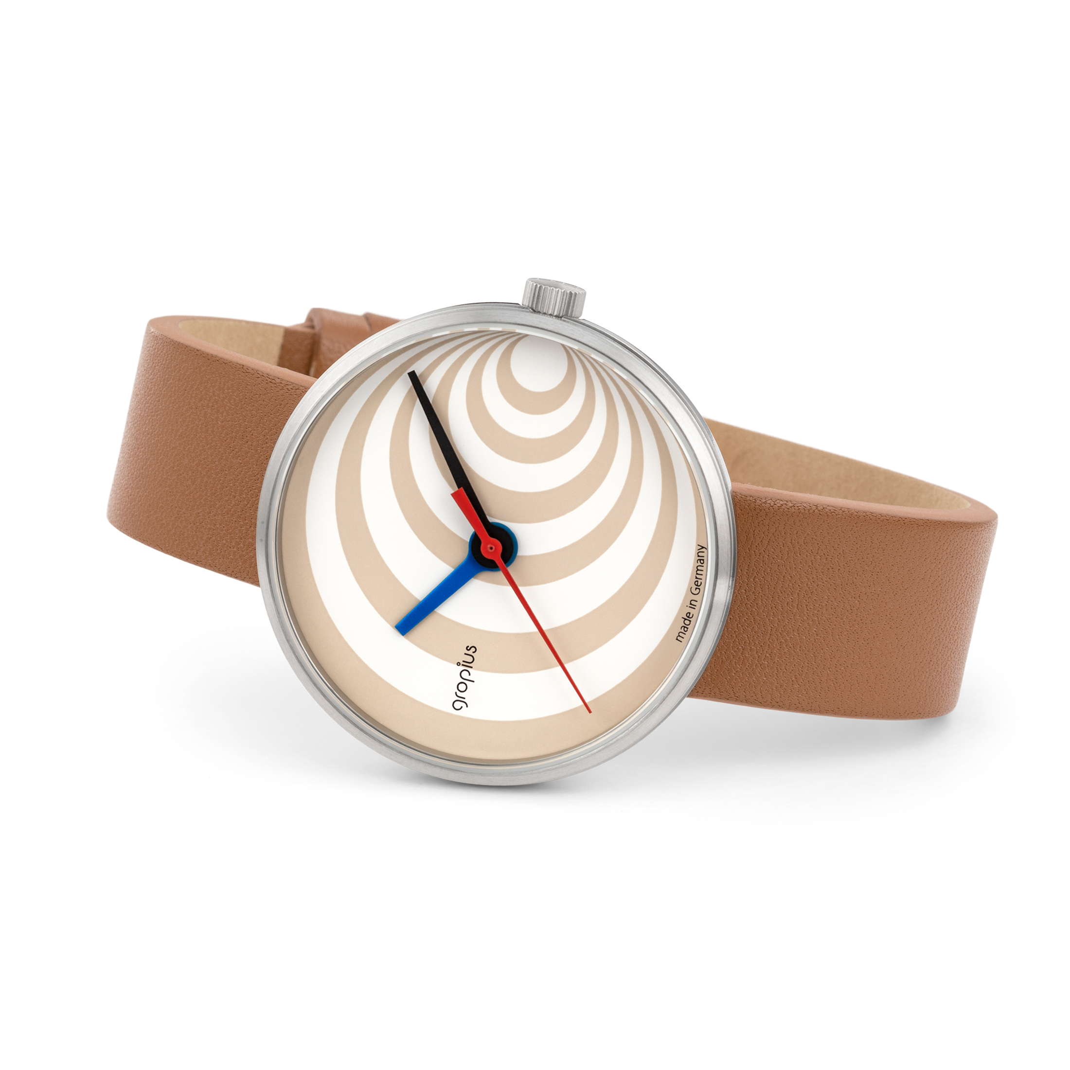 Das Design greift auf die grafischen Werke von László Moholy-Nagy und die Farbkompositionen von Josef Albers zurück und erinnert mit dem Ziffernblatt an die ikonische Wendeltreppe der Bauhaus-Universität Weimar. Das beige Lederarmband und das harmonisch abgestimmte Ziffernblatt verleihen der Uhr eine zeitlose, raffinierte Ausstrahlung.