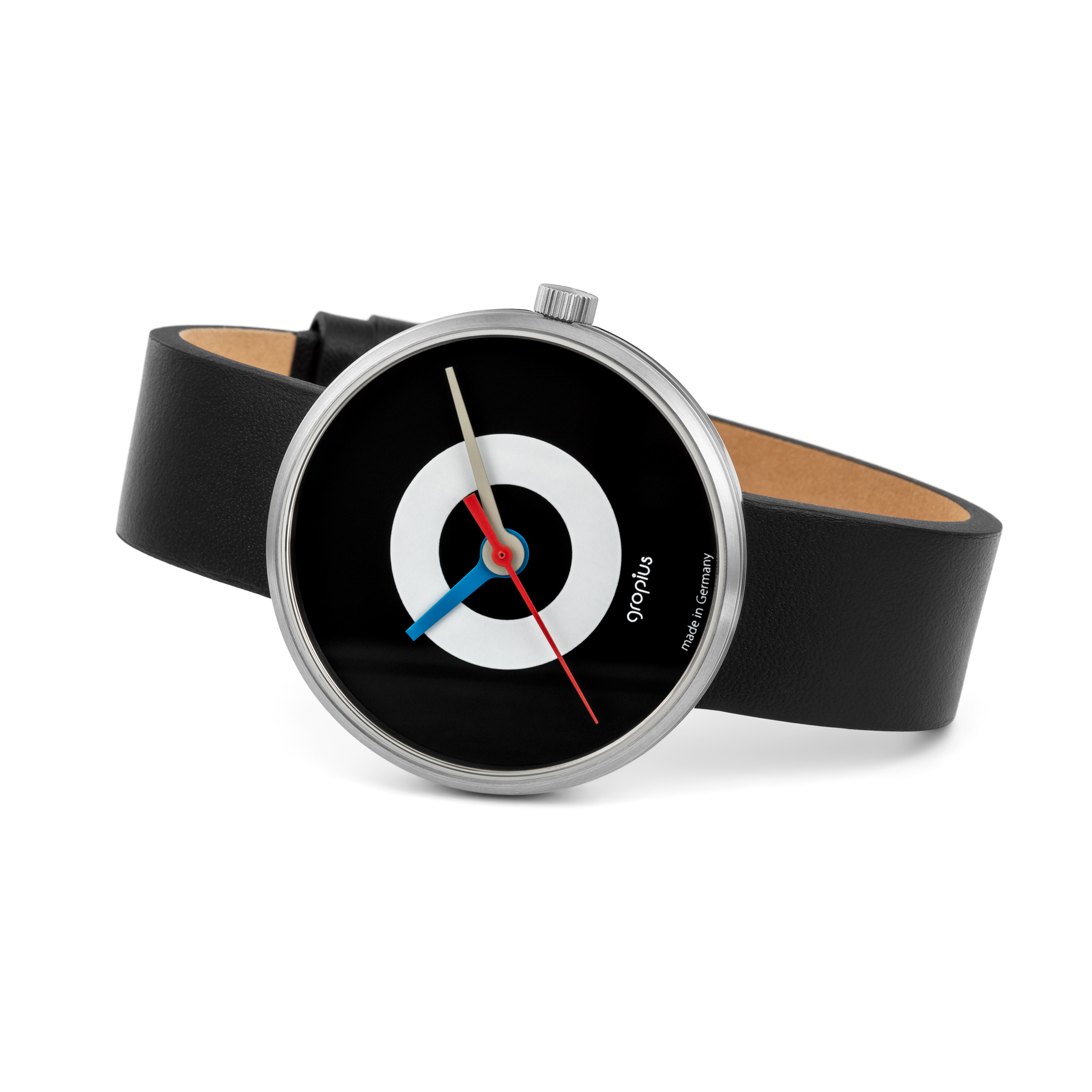 Die Walter Gropius Bauhaus J. Albers Uhr mit schwarzem Lederarmband und Ziffernblatt in Schwarz und Weiß vereint meisterhaftes Design und Funktionalität. Inspiriert von Josef Albers, einem bedeutenden Maler und Kunsttheoretiker, zielt diese Uhr darauf ab, das Bewusstsein für die Zeit zu schärfen und ein freieres Zeitempfinden zu ermöglichen.
